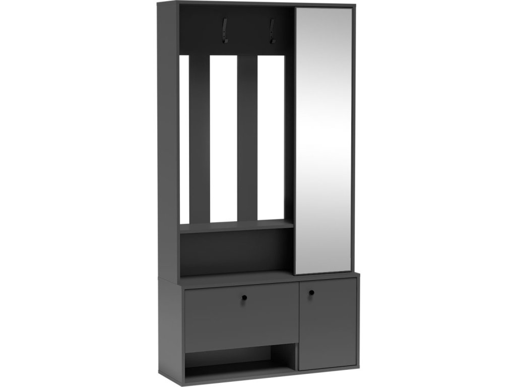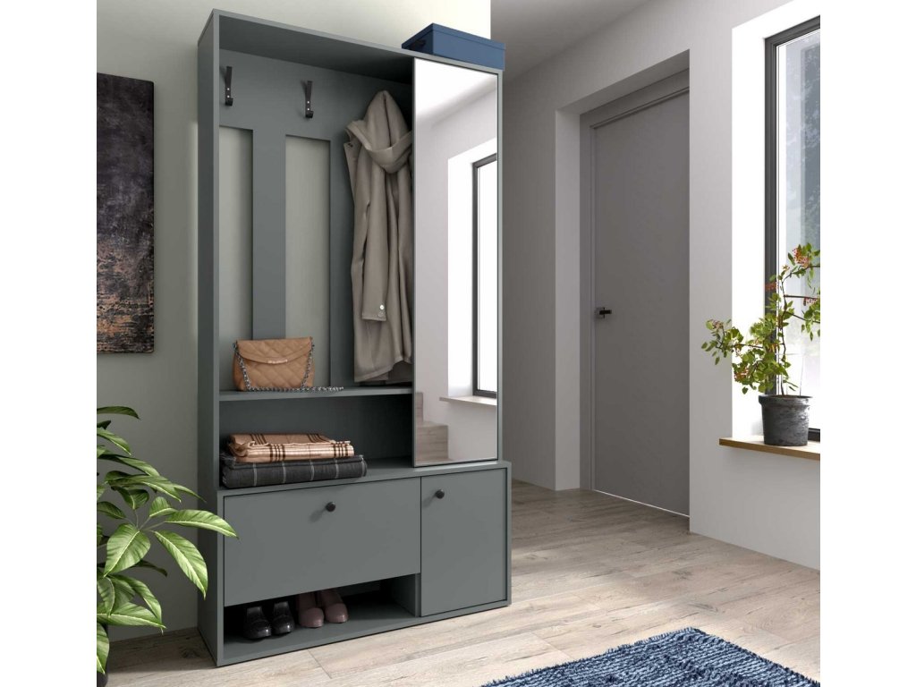 Moderní předsíňová stěna, vyrobená z kvalitní laminátové desky 16 mm v barvě světlý grafit (šedý). Zadní strana předsíně je tvořena z lamel. Sestava se skládá z věšákového panelu, 2 botníků, skříně se zrcadlem a volným prostorem. Rozměry viz obrázek. Předsíň je univerzální, dá se složit na obě strany. Dodáváme v demontovaném stavu.