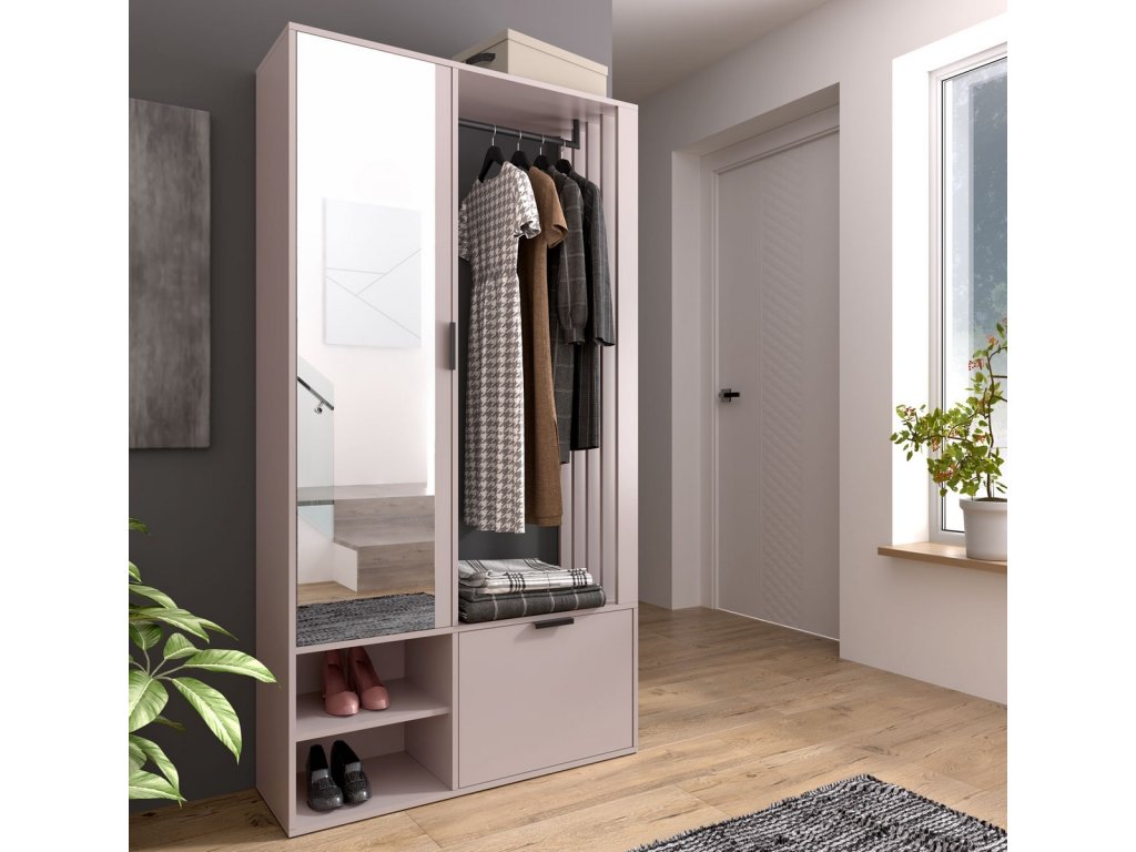 Moderní předsíňová stěna, vyrobená z kvalitní laminátové desky 16 mm v barvě kašmír (béžová s růžovým nádechem). Boční strana předsíně je tvořena z lamel. Sestava se skládá z věšákového panelu, botníku a skříně se zrcadlem a volným prostorem. Rozměry viz obrázek. Předsíň je univerzální, dá se složit na obě strany. Dodáváme v demontovaném stavu.