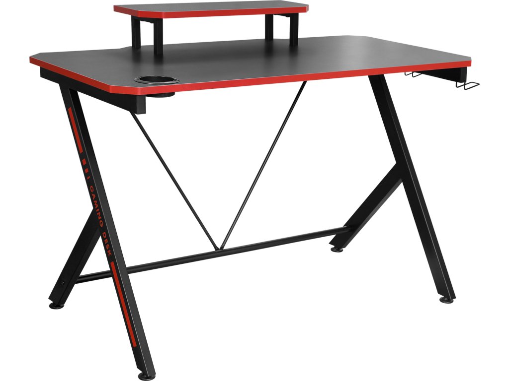 barevné provedení černá / červená kovová konstrukce, horní desky ve vzhledu materiálu z karbonových vláken police na monitor, držák na nápoje, dva háčky na příslušenství zadní hrana stolu vykrojená na protažení kabelů