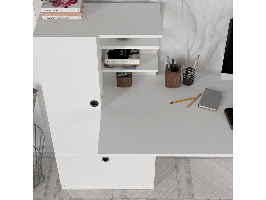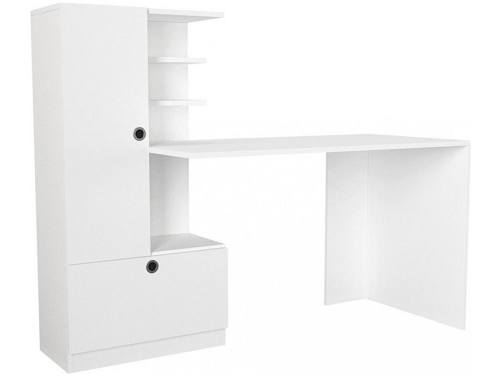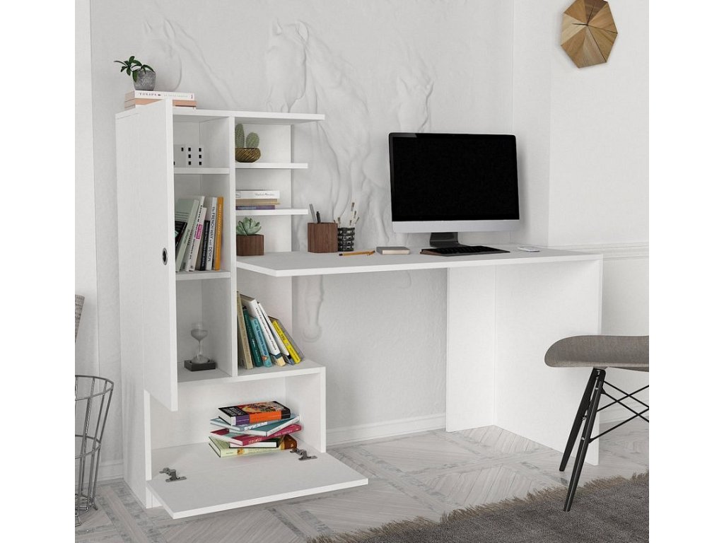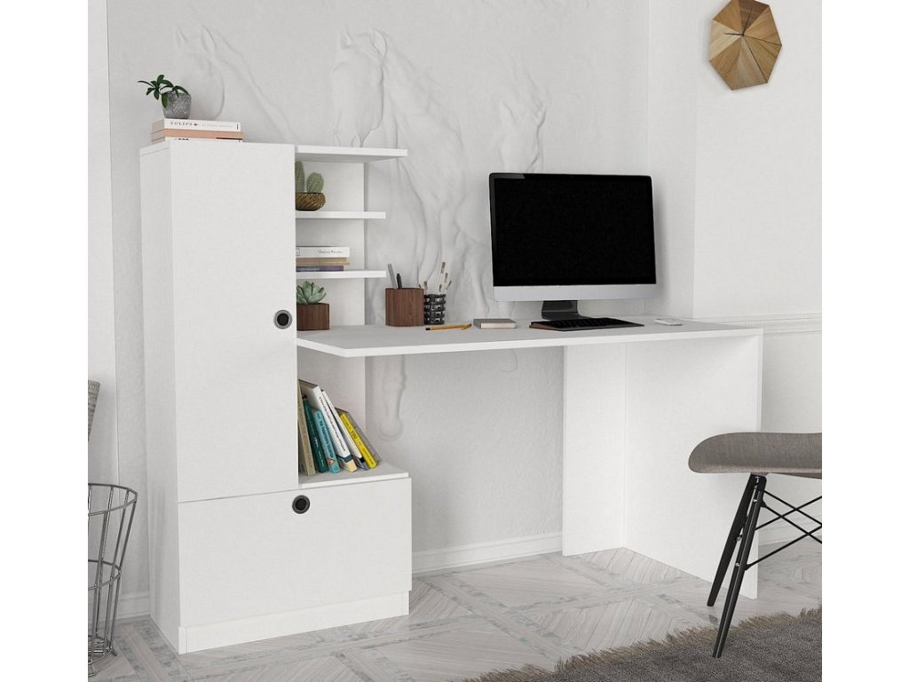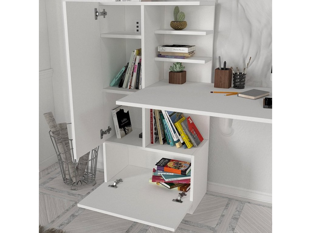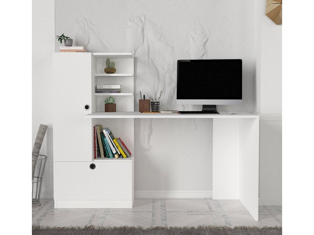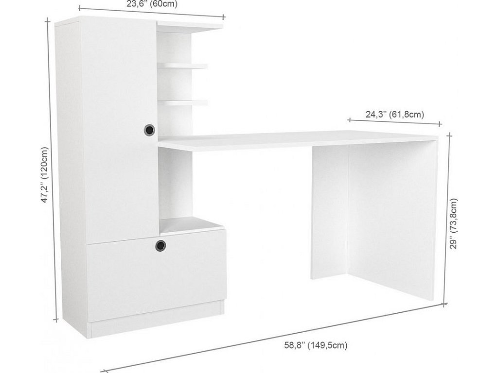 Pracovní stůl s policovým regálem je vyroben z kvalitního lamina o tl.18 mm hraněné PVC páskou, odolného proti poškrábání v barvě matná bílá. Regál disponuje úložným prostorem s dvířky a také dvířky s výklopem ve spodní části. Pracovní plocha stolu je 120 x 62 cm. Výška pracovní desky je 73,6 cm. Dodáváme v demontovaném stavu.Doplňkové parametry