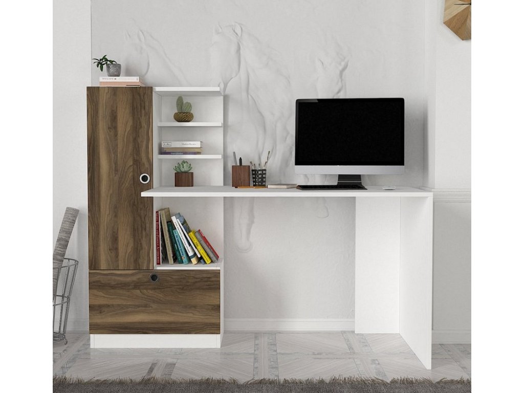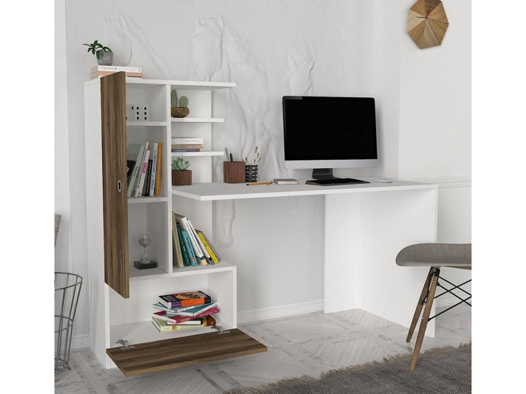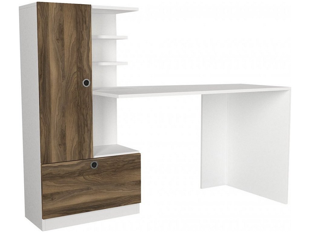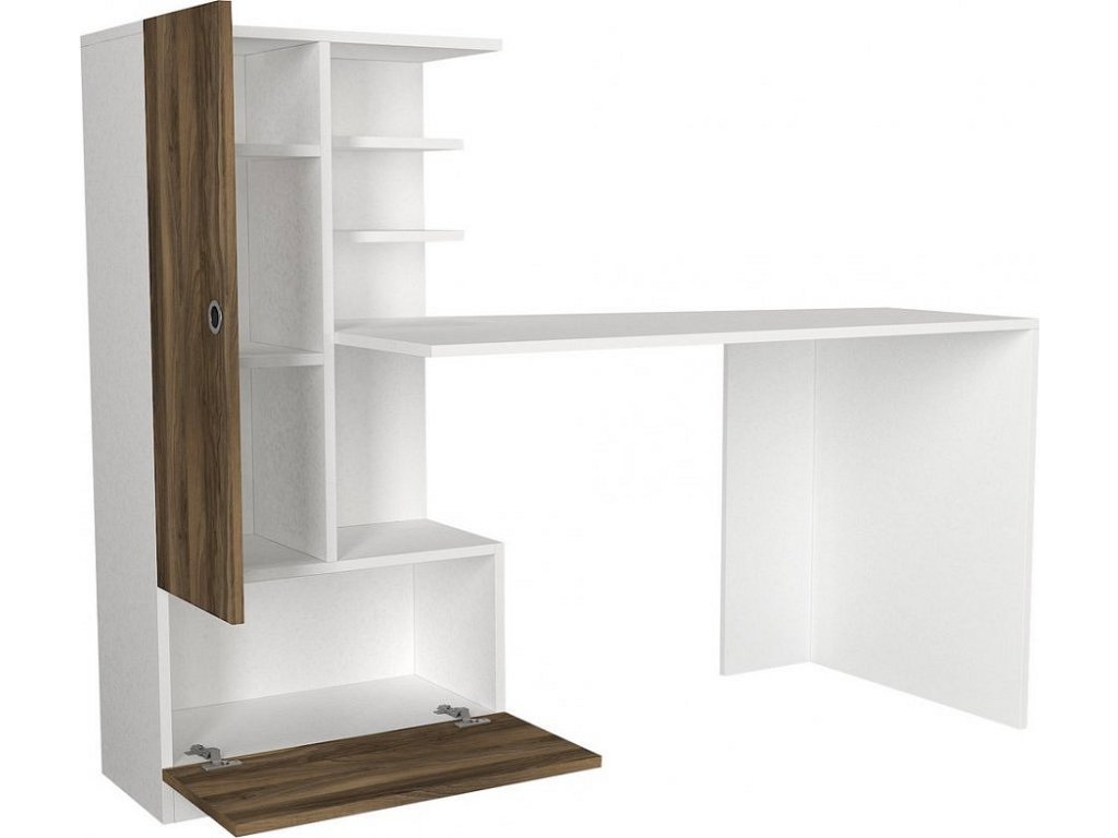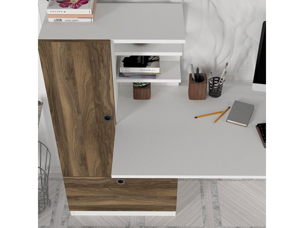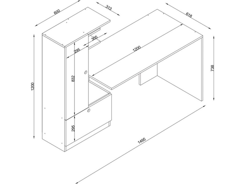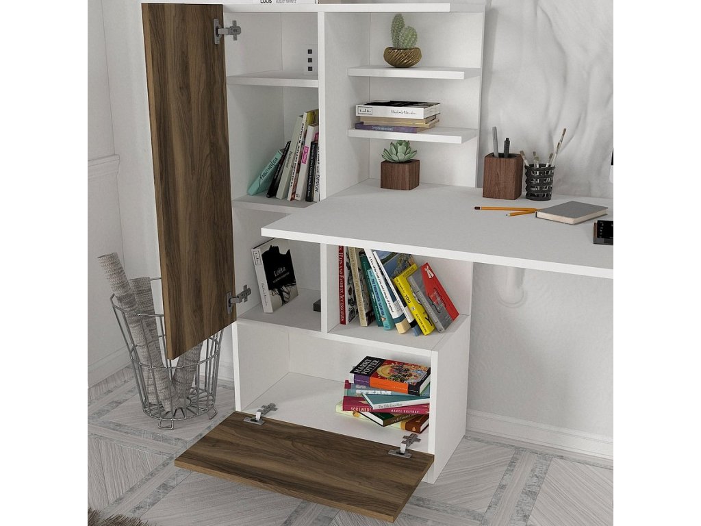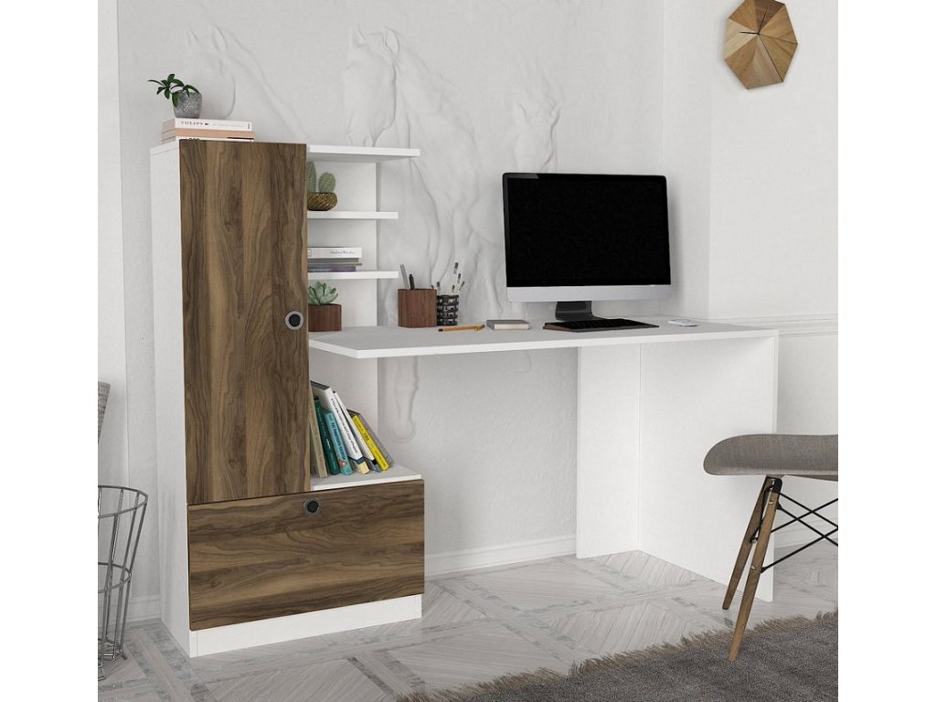 Pracovní stůl s policovým regálem je vyroben z kvalitního lamina o tl.18 mm hraněné PVC páskou, odolného proti poškrábání v barvě matná bílá. Regál disponuje úložným prostorem s dvířky a také dvířky s výklopem ve spodní části. Pracovní plocha stolu je 120 x 62 cm. Výška pracovní desky je 73,6 cm. Dodáváme v demontovaném stavu.Doplňkové parametry