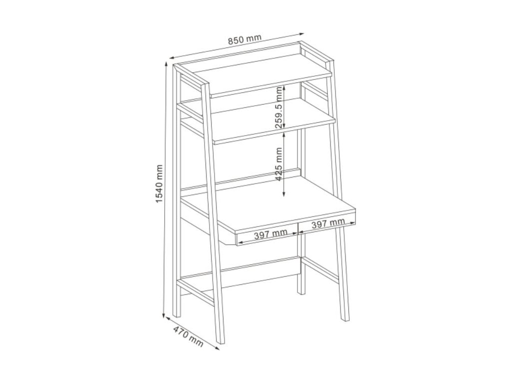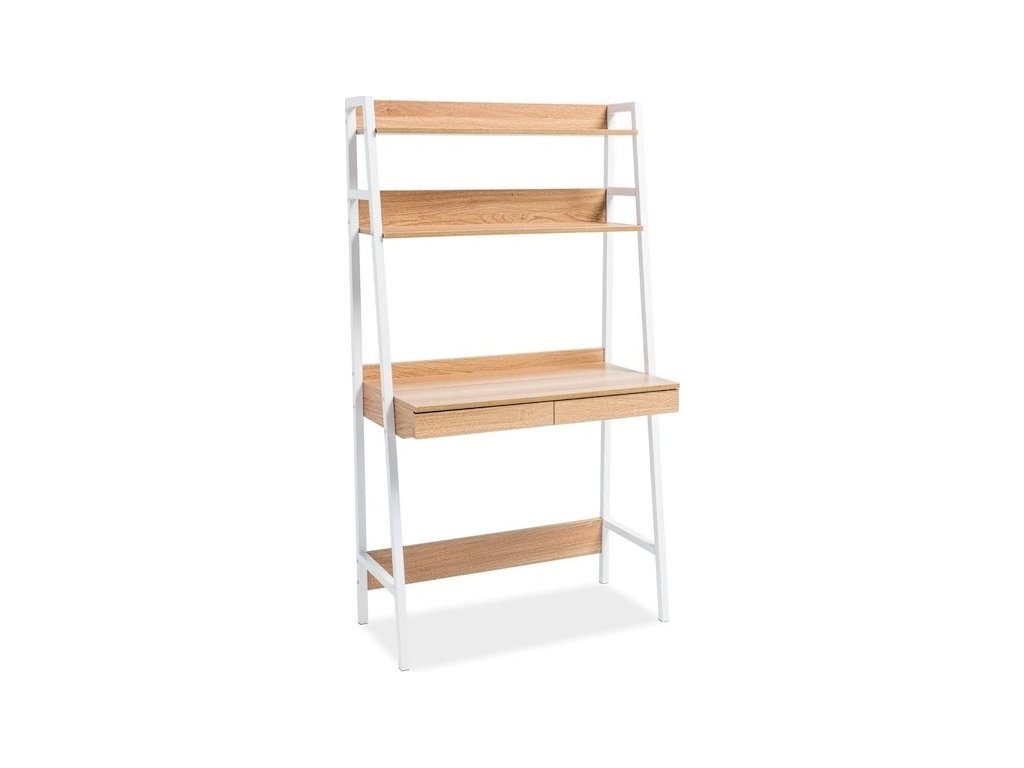 Jednoduchý, ale praktický pracovní stůl se dvěma zásuvkami. Zajímavá konstrukce nožek stolu má nahoře dvě poličky. Konstrukce je kovová v bílé barvě, deska z kvalitního MDF v barvě dub. Vhodný i pro menší pokoje.Doplňkové parametry