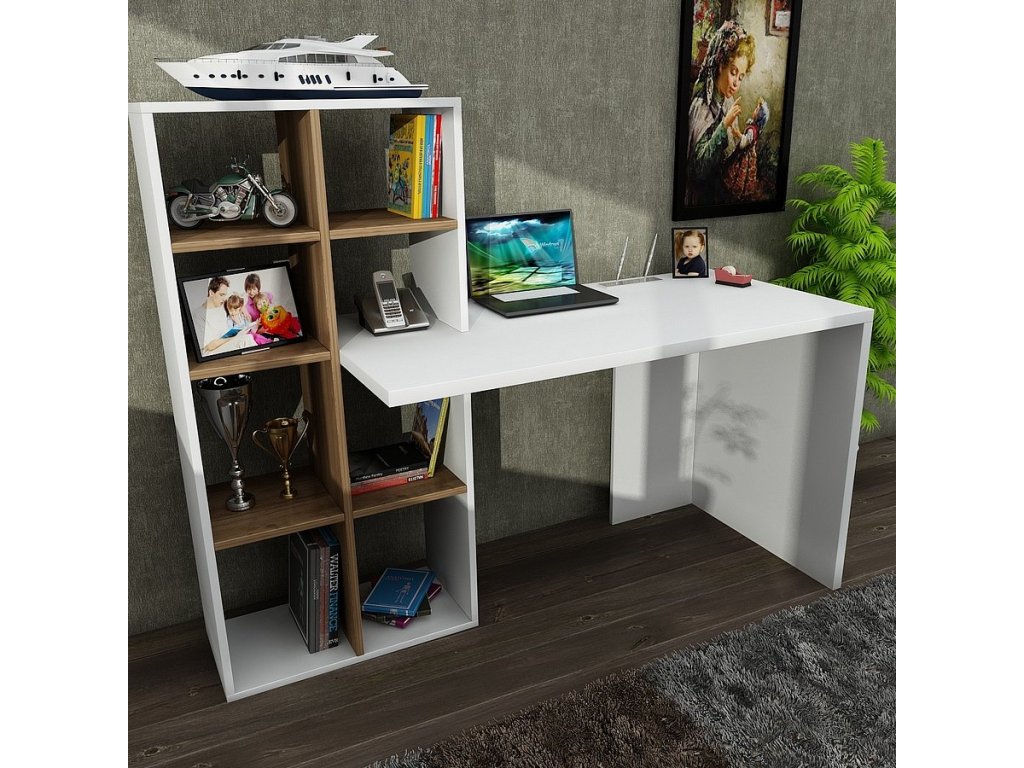 Pracovní stůl s regálem je vyroben z kvalitního lamina o tl.18 mm hraněné PVC páskou, odolného proti poškrábání v kombinaci barev matná bílá/vlašský ořech. Velikost regálu je (Š x V x H cm) 60 x 123,6 x 30 cm. Dodáváme v demontovaném stavu.Doplňkové parametry