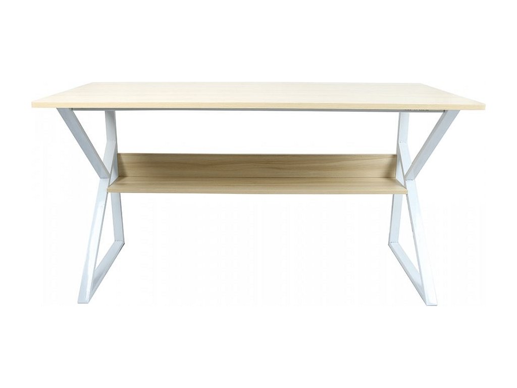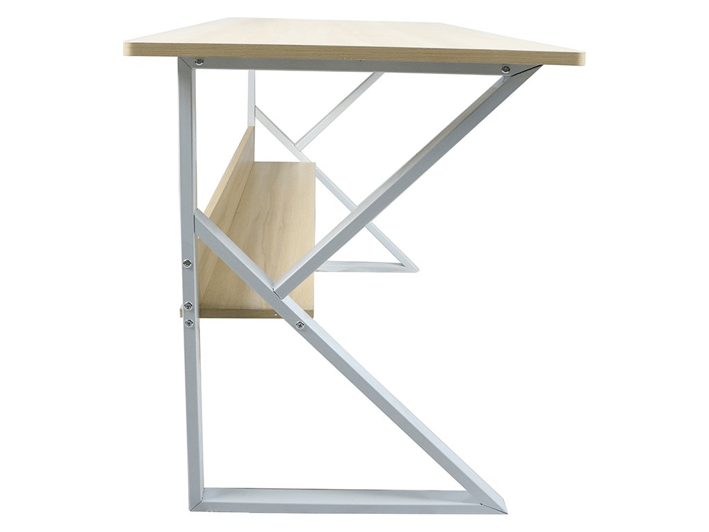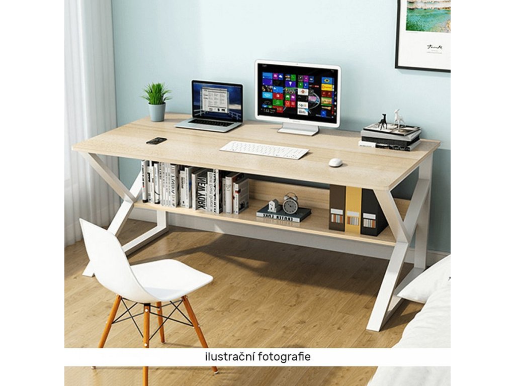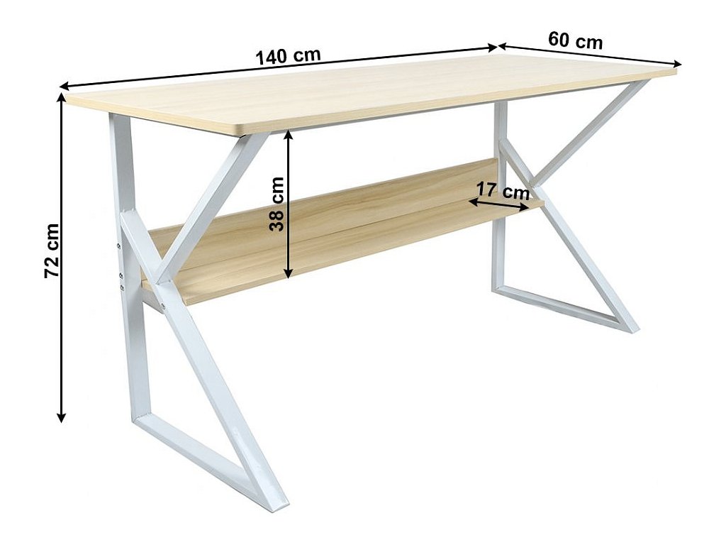 Materiál: MDF laminovaná / kov Barva: dub přírodní / bílá Rozměry (ŠxHxV): 140x60x72 cm Tloušťka materiálu plátu stolu: 18 mm Tloušťka materiálu police: 15 mm Hloubka police: 17 cm Výška mezi policí a konstrukcí: 38 cm S policí Dodávané v demontu