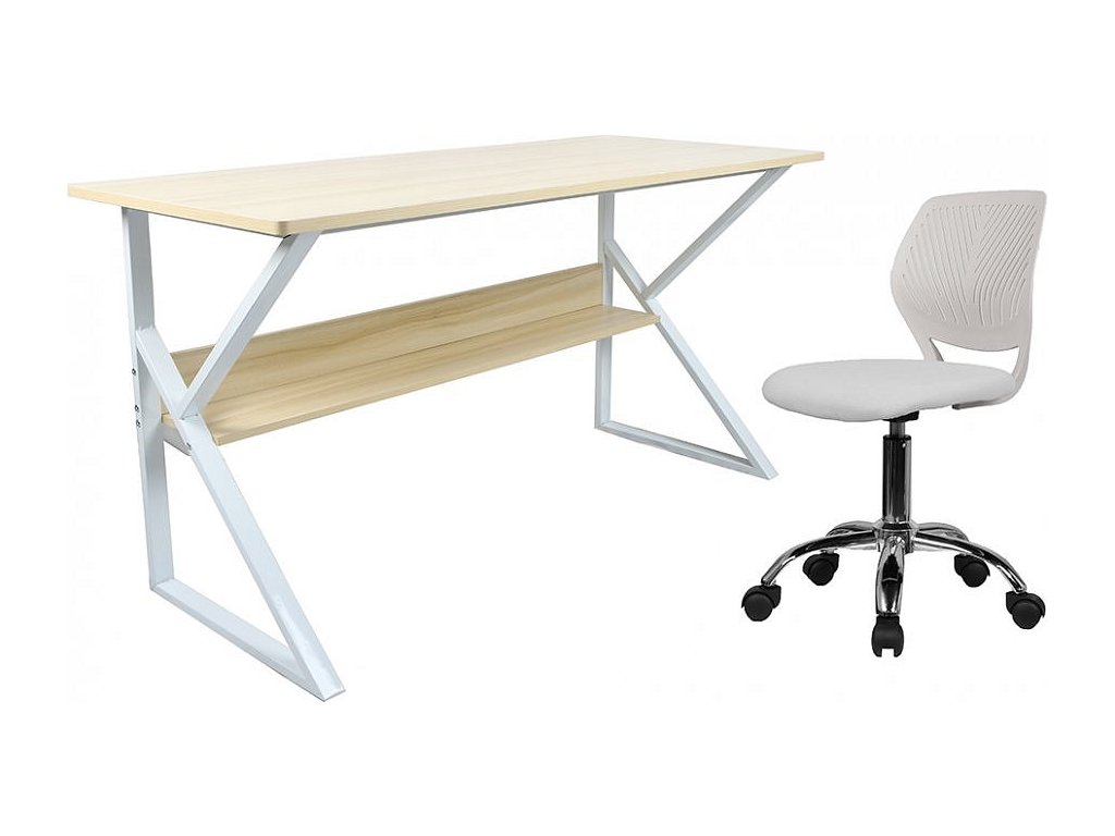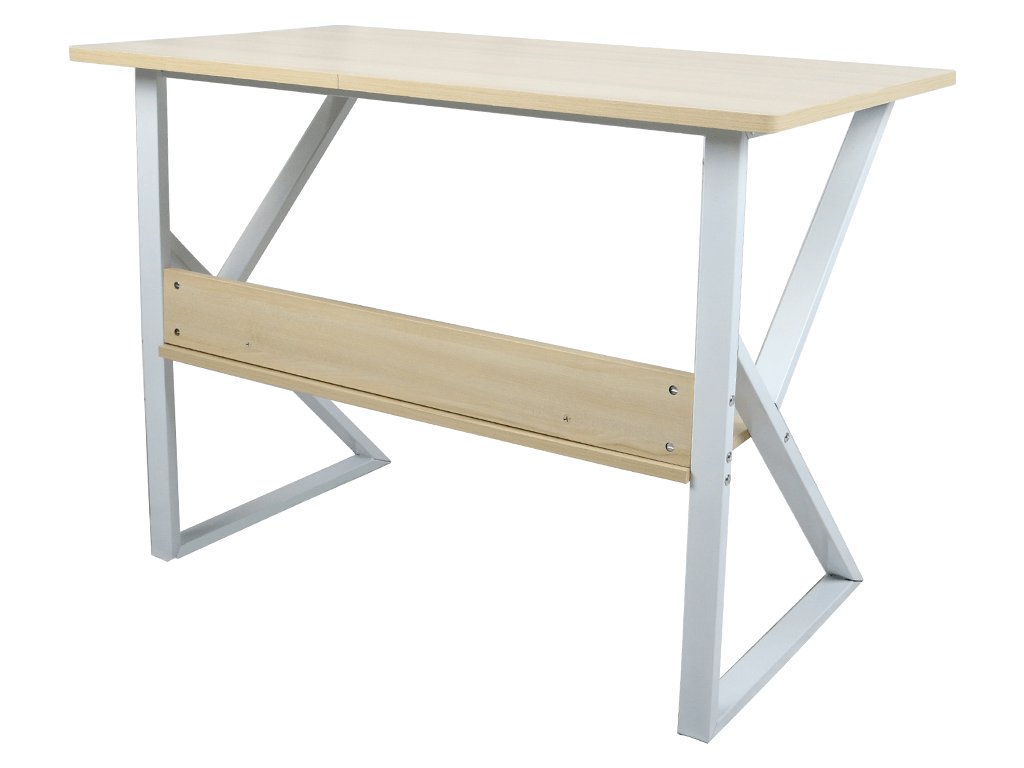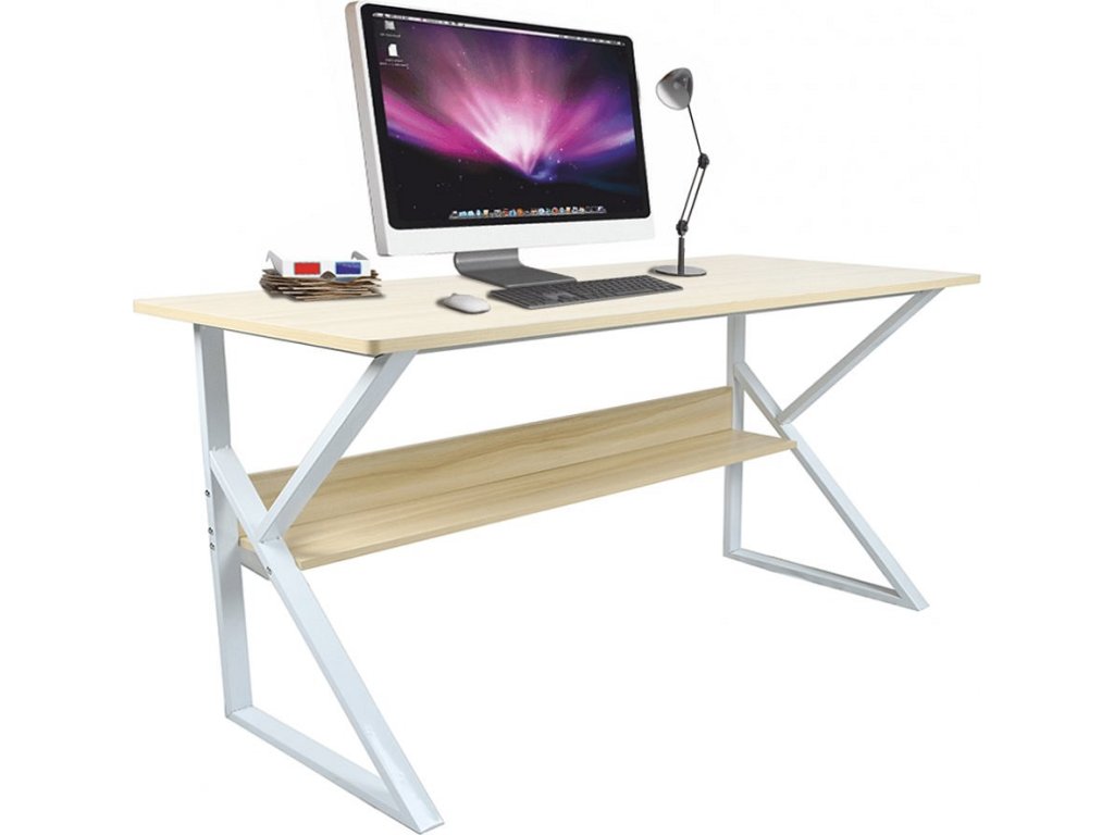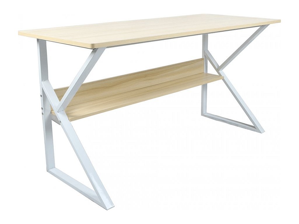 Materiál: MDF laminovaná / kov Barva: dub přírodní / bílá Rozměry (ŠxHxV): 140x60x72 cm Tloušťka materiálu plátu stolu: 18 mm Tloušťka materiálu police: 15 mm Hloubka police: 17 cm Výška mezi policí a konstrukcí: 38 cm S policí Dodávané v demontu