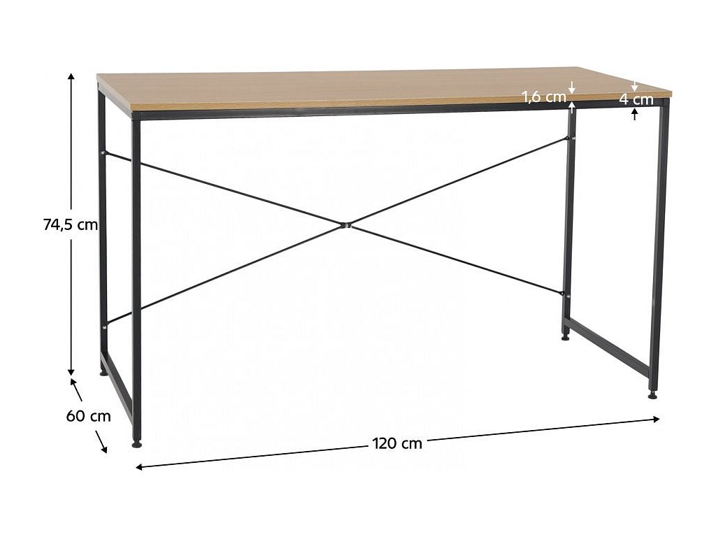 Materiál: kov / DTD laminovaná Barva: černá / dub Rozměry (ŠxHxV): 120x60x72 cm Tloušťka materiálu: 16 mm Nosnost: 80 kg Rektifikační šrouby na nohách moderní design všestranné využití Dodávané v demontu