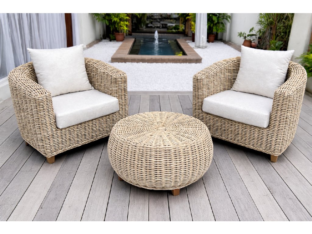 Set se skládá z 2x křeslo (92x86x76cm) a 1x ratanového stolu (průměr 80 cm výška 45 cm). Možnost přidání vrchní desky z recyklovaného teaku.