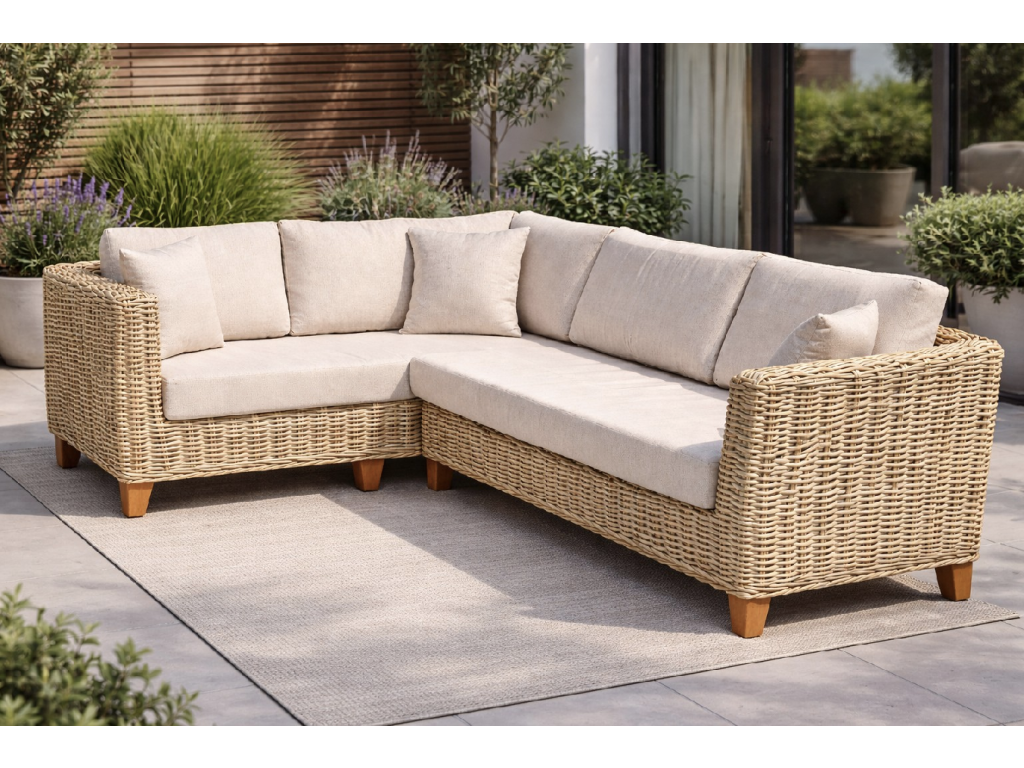 Zahradní rohová sestava je vyrobena z přírodního broušeného ratanu cubu, který se vyznačuje vysokou pevností, pružností a dlouhou životností. Tento typ ratanu patří mezi nejodolnější přírodní materiály používané pro výrobu venkovního nábytku. Díky broušenému povrchu je materiál příjemný na dotek, lépe odolává mechanickému opotřebení a zachovává si přirozený vzhled bez umělých povrchových úprav.