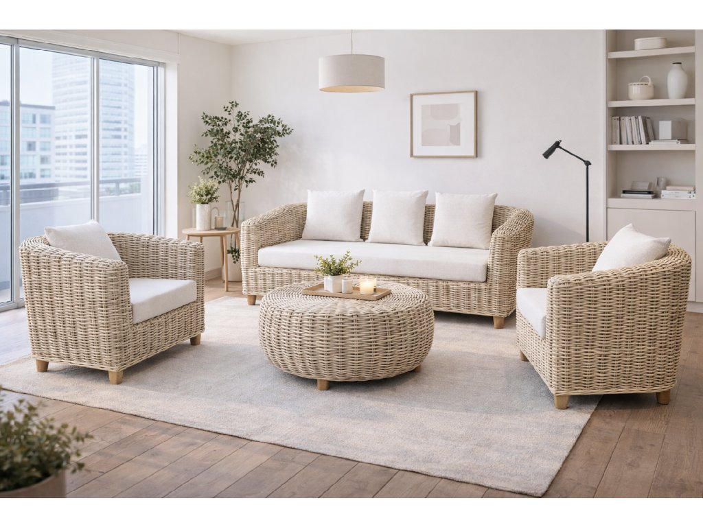 Set se skládá z 2x křeslo (92x86x76cm), 1x sofa (188x86x76cm) a 1x ratanového stolu (průměr 80 cm výška 45 cm) .
