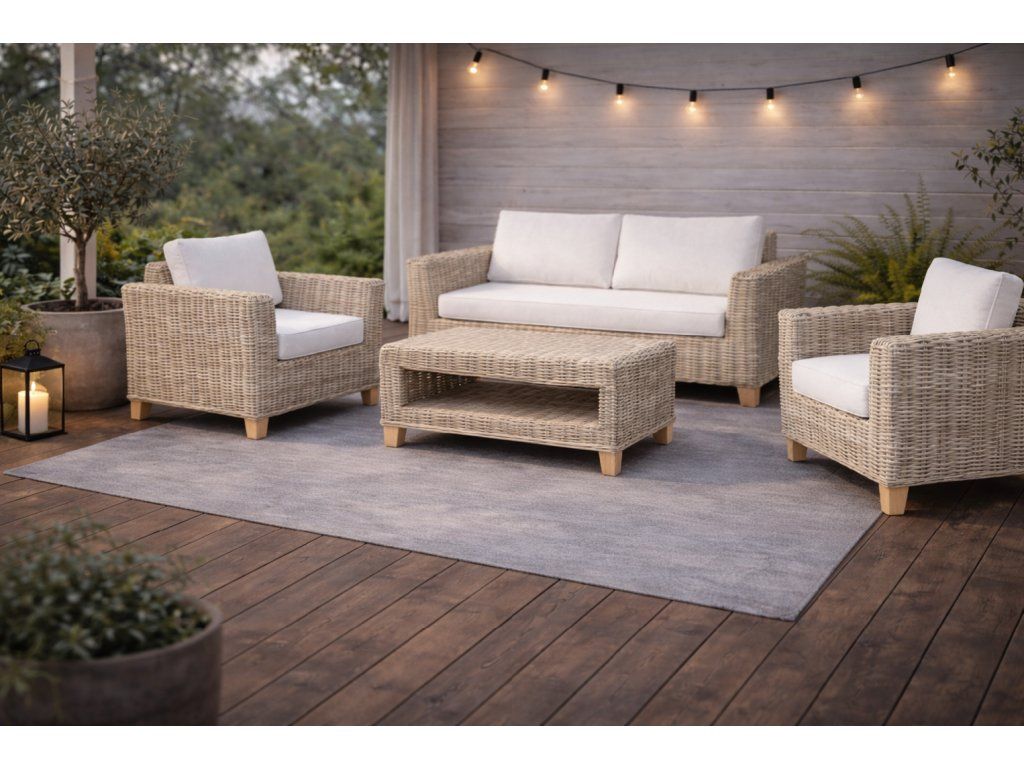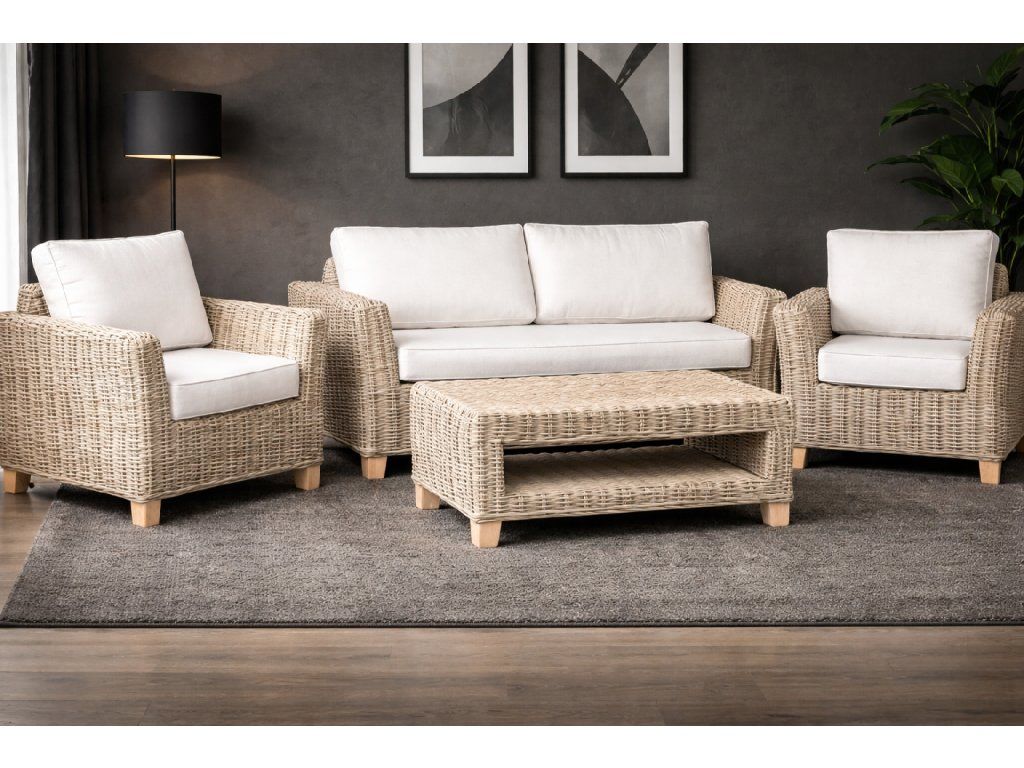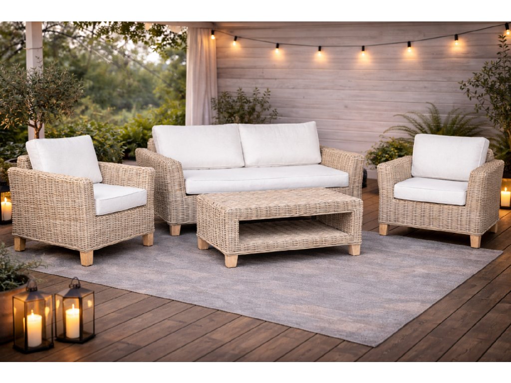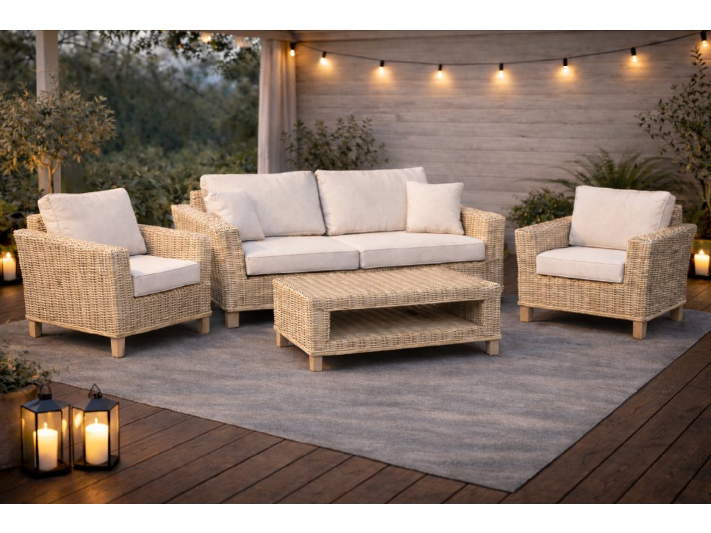 Set se skládá z 2x křeslo (103x93x76cm), 1x sofa (199x93x76cm) a 1x ratanového stolu (115x65x45cm) .