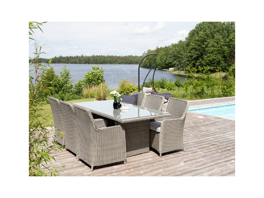 Jedálenská zostava záhradného nábytku s obdĺžnikovým jedálenským stolom z umelého ratanu a stolovou doskou zo skla. Súčasťou jedálenského nábytku je šesť pohodlných kresiel. Podsedáky sú súčasťou nábytku. Zloženie nábytku: 1x stôl so sklenenou doskou, 6 ks kresiel so sedákomMateriál: hliníkový rám a syntetický ratanUV ochrana: ÁNOFarba: šedáRozmery stola: Rozmery kresla: 62 x 65 x 94,5 cm Š/H/V