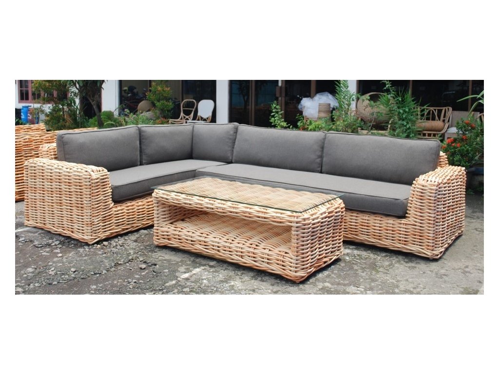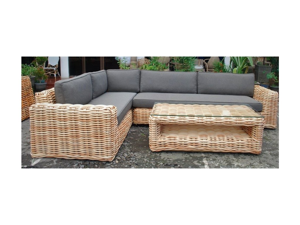 Sestava se skládá : levá část 230x100x74cm a pravá část 340x100x74cm a ratanový stolek s pevnostním sklem 140x70x50cm.