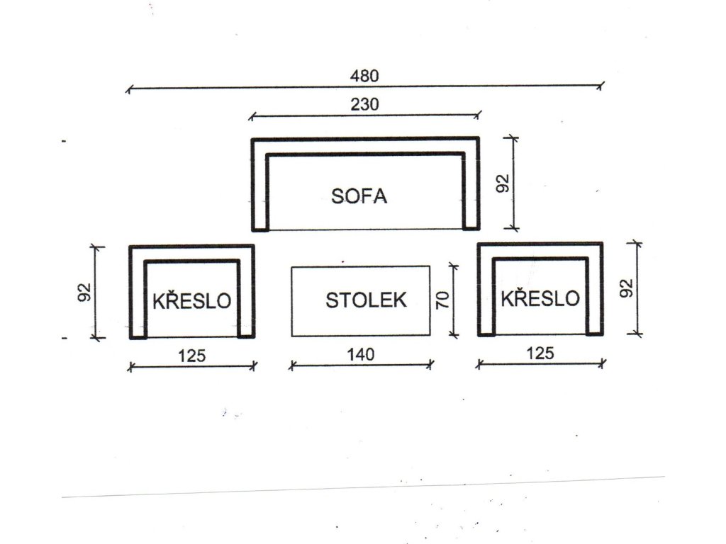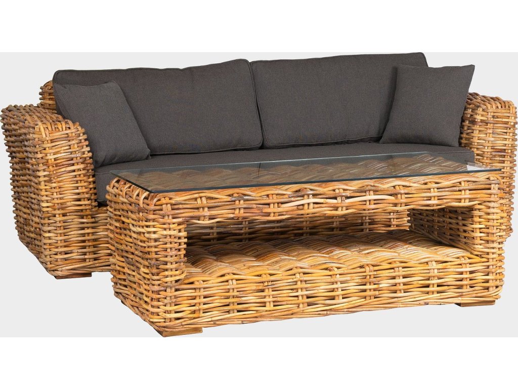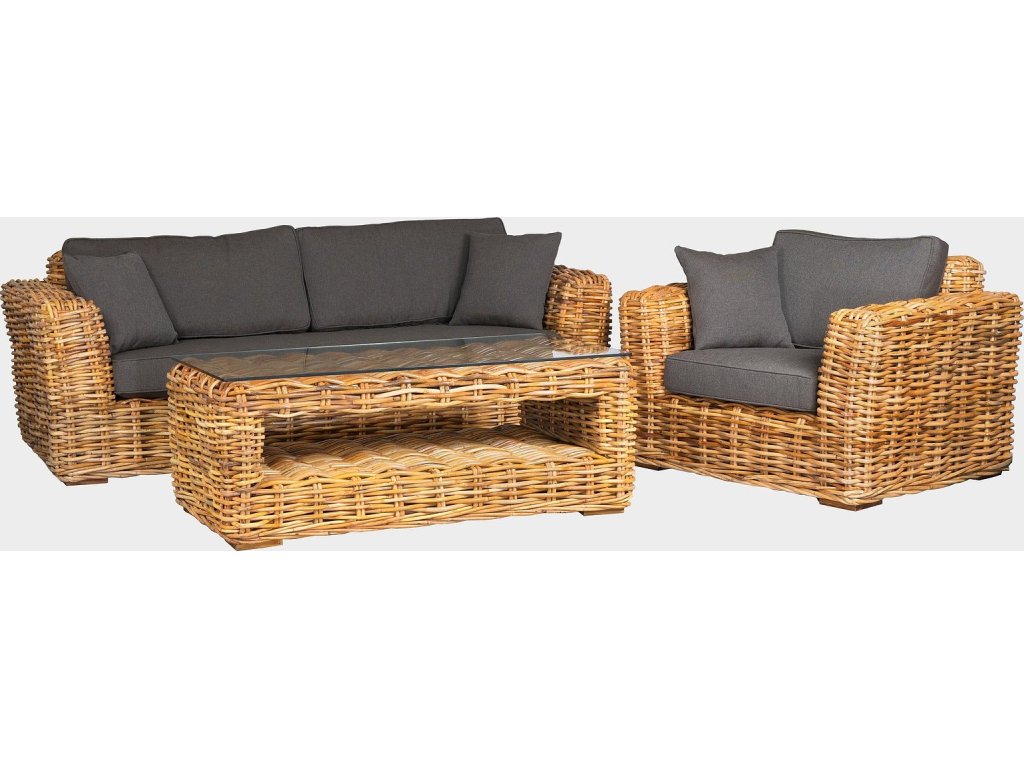 Sestava se skládá : 2 x křeslo- 125x92x74 cm , sofa - 230x92x74 cm, stolek z rattanu -140x70x50cm.
