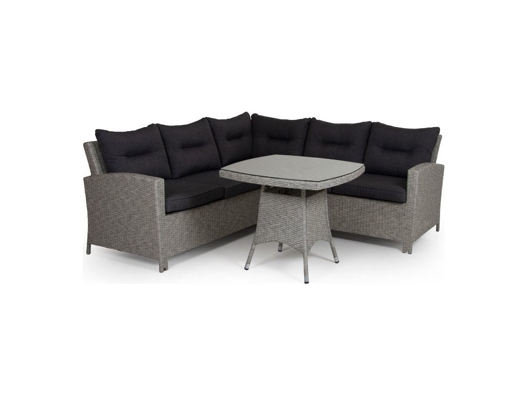 Rohová záhradná súprava so stolom, vyrobená z umelého ratanu, ktorú tvorí pevný hliníkový rám. Doplnená je textilným polstrovaním v antracitovej farbe. Farba ratanu šedá. Samostatne nepredajné.Materiál: syntetický 100% recyklovateľný ratanKonštrukcia: hliníkováRozmery sadačky: 198 x 198cm Š/HFarba ratanu: šedáFarba textilného polstrovania: antracitová