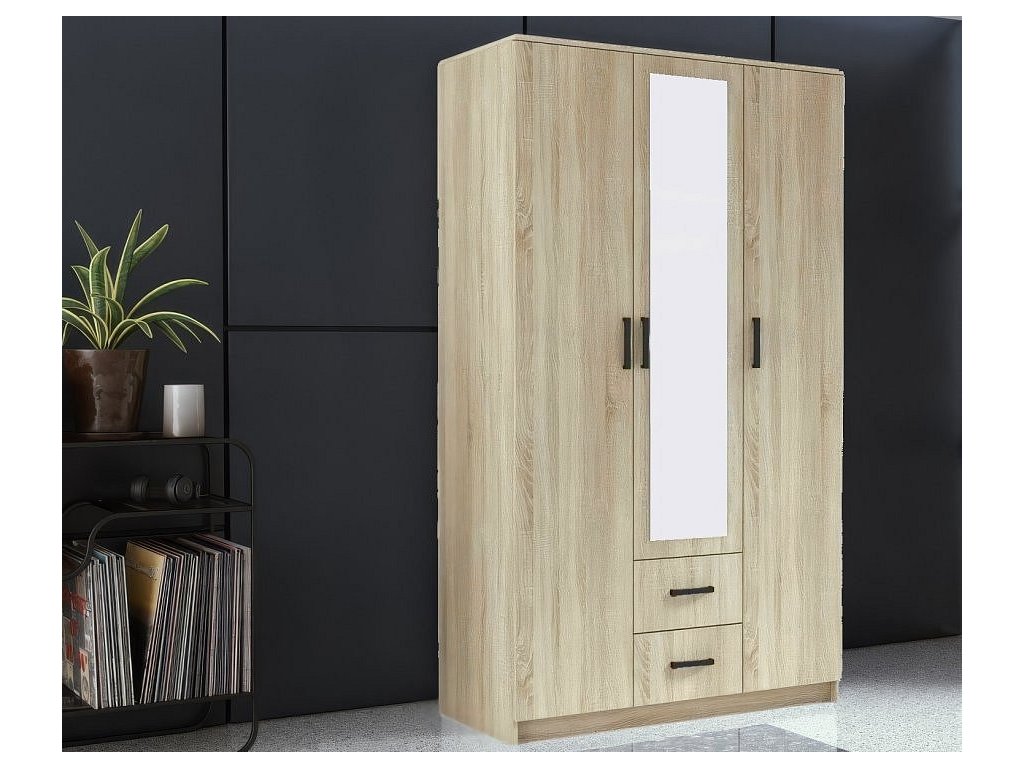 Jednoduchá šatní skříň se zrcadlem, která se díky svým rozměrům vejde i do malých prostorů. Korpus i dveře jsou z kvalitní LTD desky v barvě dub sonoma. Nezvyklá výška 205 cm nabídne opravdu dostatek prostoru. Vnitřní rozložení skříně nabízí na jedné straně police, na druhé straně šatní tyč a 2 šuplíky. Dodáváme v demontovaném stavu.Doplňkové parametry