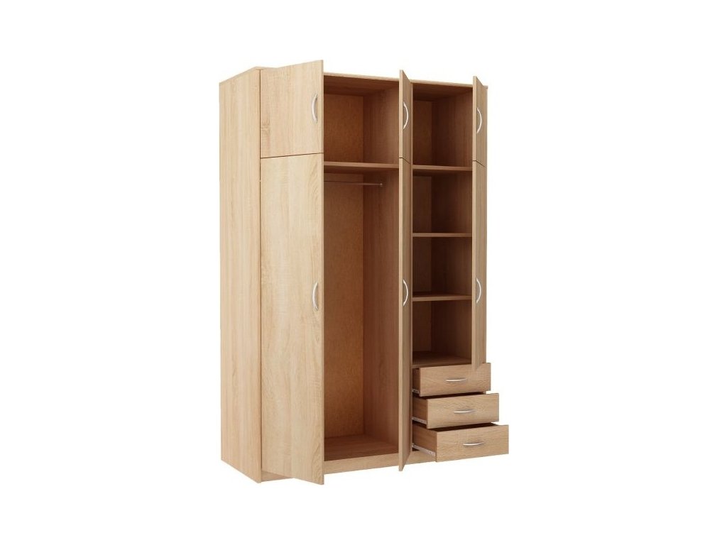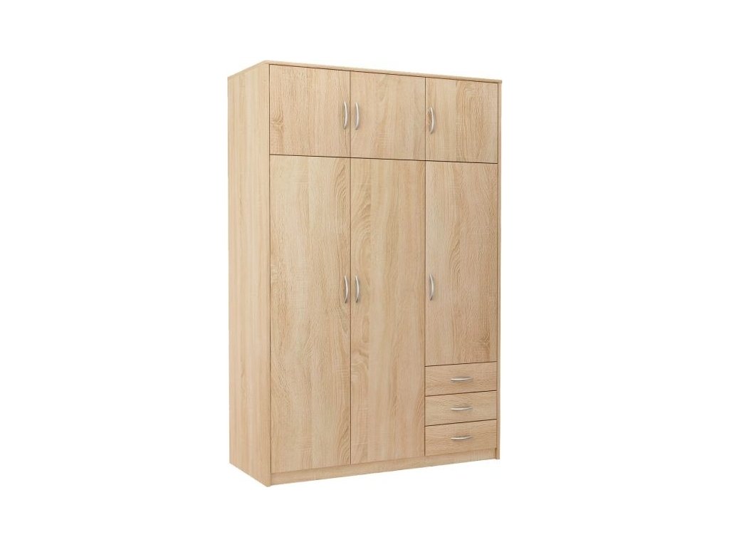 Šatní skříň VIKA v jednoduchém, ale velmi praktickém provedení a moderním designu. Korpus i dvířka jsou z kvalitní LTD v barvě dub sonoma. Lamino je odolné vůči vysokým teplotám, poškrábání a nárazům, hraněné ABS páskou. Jasně viditelná struktura dřeva. V pravé třetině skříně jsou 3 zásuvky a za dvířky 2 police, nalevo volný prostor se šatníkovou tyčí, nahoře nádstavec se 3 dvířky. Dodáváme v demontovaném stavu.Doplňkové parametry