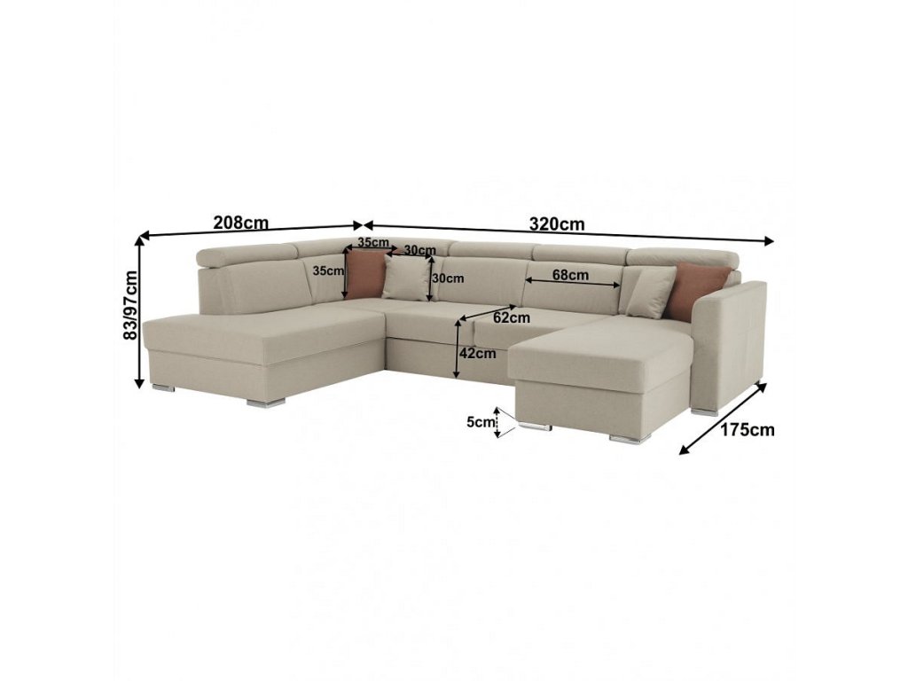;"Celočalouněná luxusní sedací souprava, levá, s rozkladem a úložným prostorem MARIETA U. Rozměry: (ŠxHxV): 320x208-175x83-97 cm, plocha na spaní (ŠxD): 130x260cm Nosnost na osobu: 90 kg Materiál: látka cable 02/05 Oděruodolnost textilie podle testu Martindale: 72 000 oděrek Barva: béžová 02 / cihlová 05 Dodávané s polštáři: 4 ks Výška spodního prostoru od podlahy: 5 cm 4 polohovací opěrky hlavy Dodávané v demontu. Nabízíme vám možnost složit si sedačku ve vlastním rozměru a podle vlastních potřeb. Komponenty na složení hledejte v naší nabídce. Máme pro vás hned sedm barev látky Cable a sedm barev ekokůže, kombinovat tedy můžete dle libosti. Odstíny najdete v přiloženém vzorníku. Výběr barevného odstínu poznamenejte při objednávání přímo do poznámky. Při individuální objednávce je třeba zaplatit 10% zálohu z dané částky. Po uhrazení zálohy bude Váš požadavek zadána do výroby. Doba dodání 8-10 týdnů. Cena takto složené sedačky v jiné barvě závisí na počtu jednotlivých dílů, které ji tvoří. Doporučujeme prověřit si konečnou cenu na e-mail adrese nakup@tempo-kondela.sk.