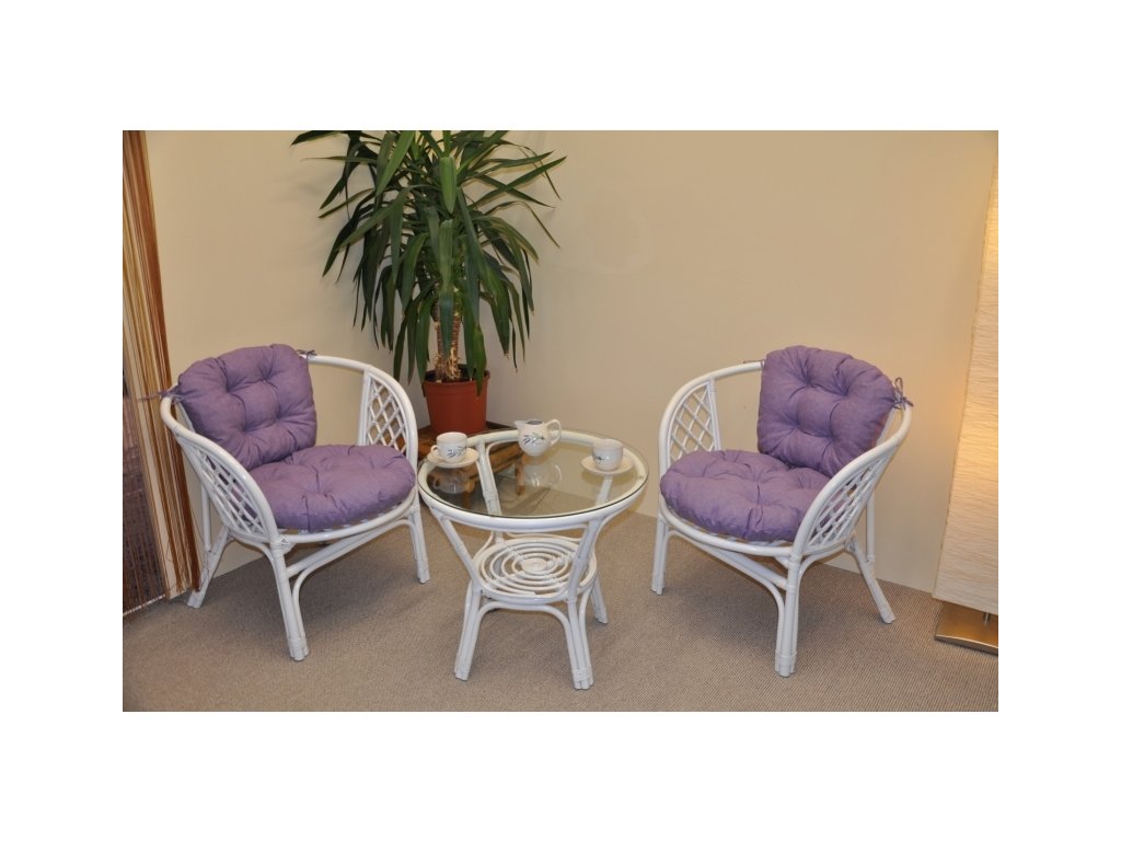 Ratanová sedací souprava je vyrobena z přírodního ratanu s barvou konstrukce odpovádající fotografii výrobku,obsahuje 2 křesla a stolek se sklem, kompletní sadu polstrů vyrobených v ČESKÉ REPUBLICE. | Barva ratanové konstrukce i výpletu je bílá.