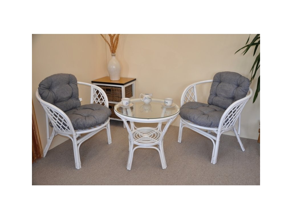 Ratanová sedací souprava je vyrobena z přírodního ratanu s barvou konstrukce odpovádající fotografii výrobku,obsahuje 2 křesla a stolek se sklem, kompletní sadu polstrů vyrobených v ČESKÉ REPUBLICE. | Barva ratanové konstrukce i výpletu je bílá.