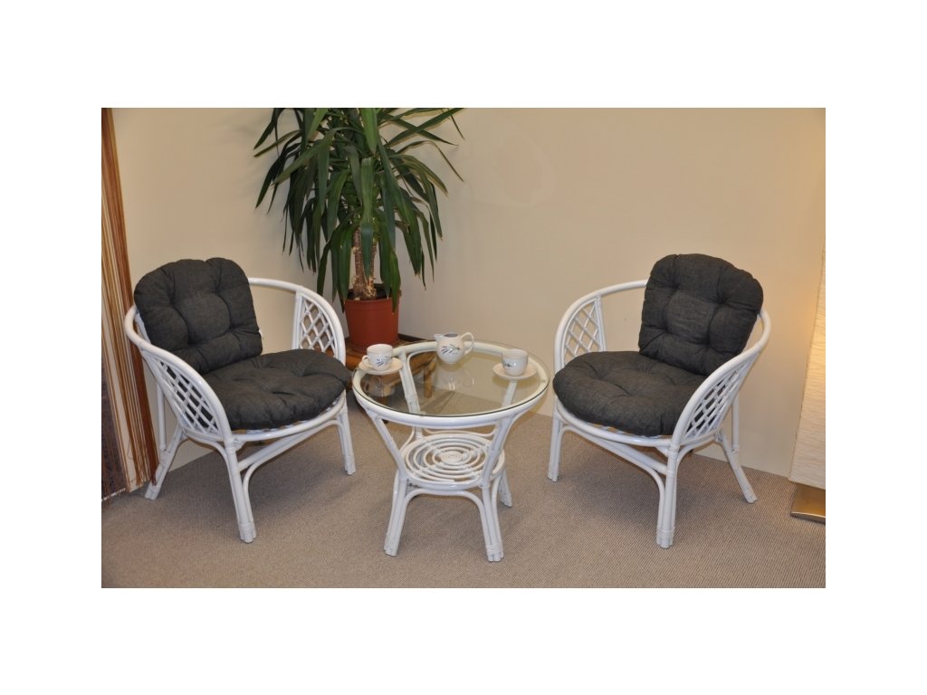 Ratanová sedací souprava je vyrobena z přírodního ratanu s barvou konstrukce odpovádající fotografii výrobku,obsahuje 2 křesla a stolek se sklem, kompletní sadu polstrů vyrobených v ČESKÉ REPUBLICE. | Barva ratanové konstrukce i výpletu je bílá.