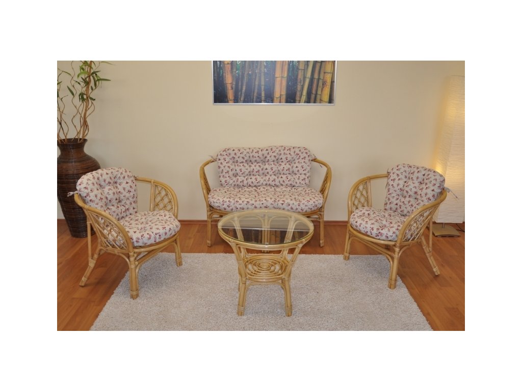 Ratanový nábytek - ratanová sedací souprava Bahama je vyrobena z přírodního ratanu s barvou konstrukce v medovém odstínu. Souprava obsahuje pohovku, 2 křesla, stolek se sklem a kompletní sadu polstrů vyrobených v České republice.