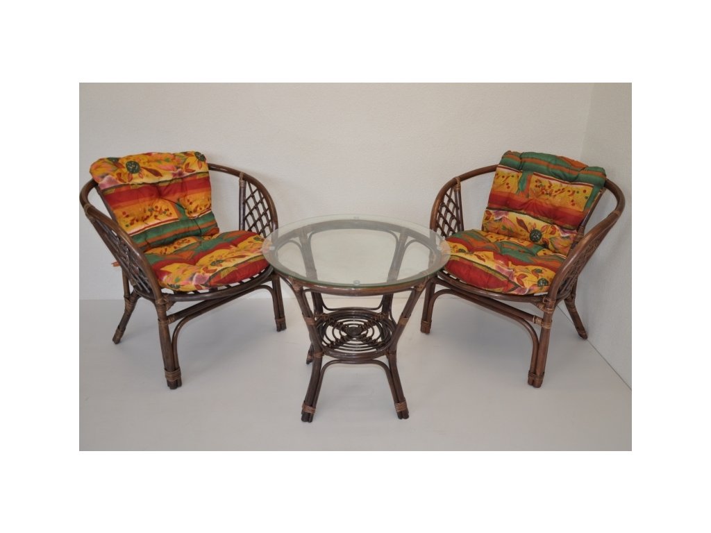 Ratanová sedací souprava Jawa vychází konstrukčně z velice oblíbené sedací soupravy Bahama. Sedací soupravu prodáváme jako celek 2 křesílka, stolek se sklem a sadu polstrů.