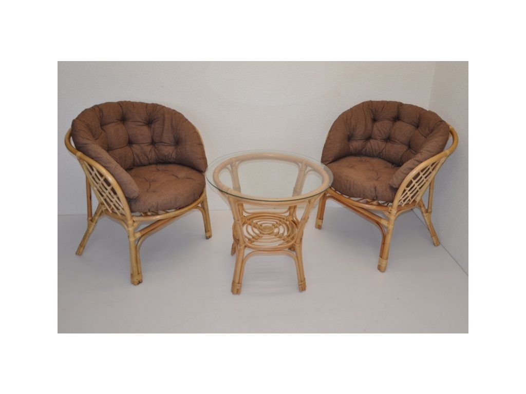 Ratanová sedací souprava Jawa vychází konstrukčně z velice oblíbené sedací soupravy Bahama. Sedací soupravu prodáváme jako celek 2 křesílka, stolek se sklem a sadu polstrů.
