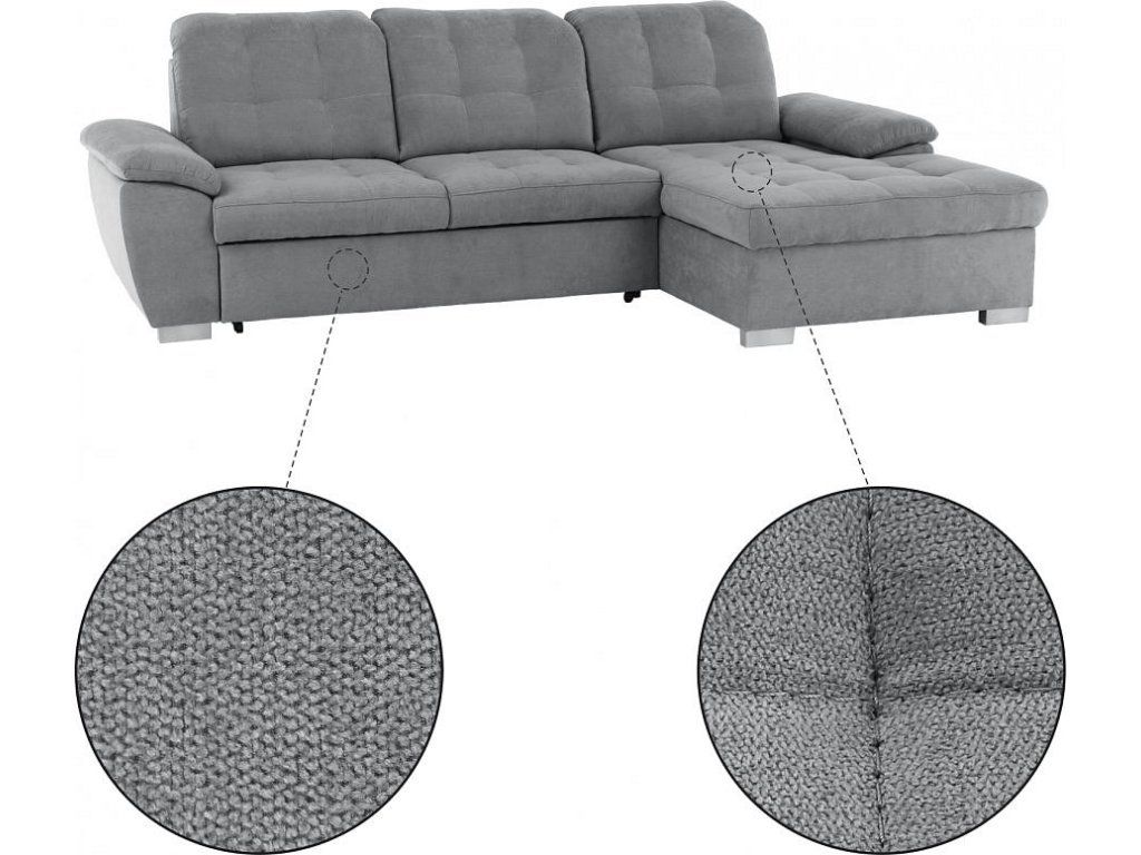 Rohová celočalouněná rozkládací sedací souprava s úložným prostorem EVANGELIN Materiál: látka Soro 90 Oděruodolnost textilie podle testu Martindale: 90 000- 100 000 oděrů Barva: šedá Rozměry (ŠxHxV): 258x164x102 / 86 cm Plocha na spaní (ŠxD): 197x126 cm Výška spodního prostoru od podlahy: 5,5 cm Výška sedu: 41 cm Hloubka sedu: 56 cm Délka pohovky s opěrkou: 184 cm Bez opěradla: 172cm Šířka bez boku: 68,5 cm Šířka Otomanů: 96,5 cm (spolu s bokem) Nosnost na osobu: 90 kg Pravé provedení. Dodávané bez dekorativních polštářů Polohovací opěrky hlavy. 6 stupňové polohování opěrek Dodávané v demontu.