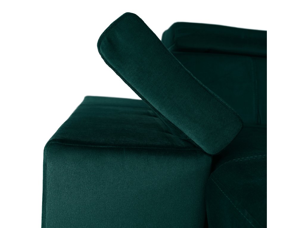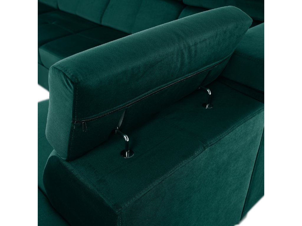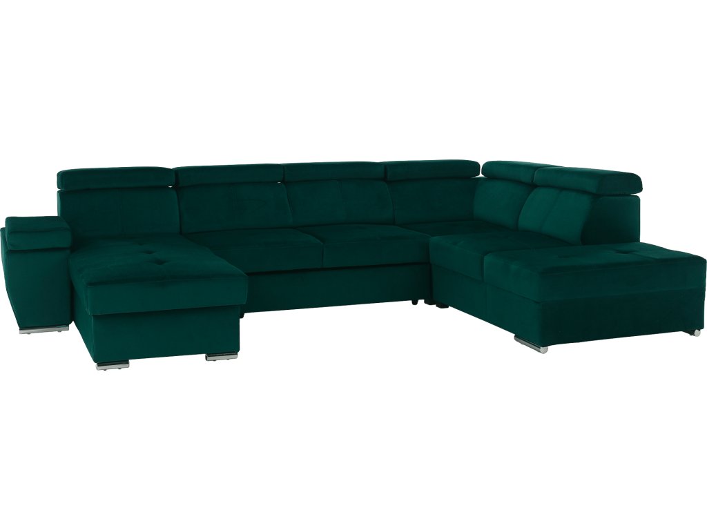 Materiál: látka KRONOS Oděruodolnost textilie podle testu Martindale: 60 000 oděrek Barva: smaragdová 19 Rozměry: (ŠxHxV): 329x220x79 / 97 cm Rozměry plochy na spaní (ŠxD): 256x129 cm Hloubka sedu: 57 cm Výška sedu: 41 cm Výška spodního prostoru od podlahy: 4,5 cm Šířka volného prostoru mezi otomany: 133 cm 6 polohovacích opěrek hlavy 5 stupňové polohování opěrek 1 polohovací opěrka ruky S úložným prostorem rozkládací celočalouněná Exkluzivní a moderní vzhled Levé provedení Výplň sezení: pružiny faliste a pur pěna T30KG / m3, tloušťka pěny 10 cm Výplň opěrky: elastické pásy a pur pěna T25 / m3, tloušťka pěny 7 cm Dekorativní polštáře nejsou součástí balení Dodávané v demontu Možnost objednání v 6 barevných provedeních látky Kronos. Dodací lhůta 8-10 týdnů.