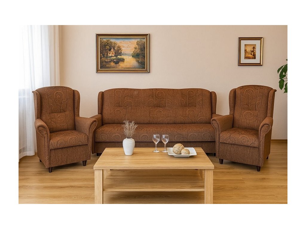 Sedací souprava Agáta MAX je stále velmi oblíbeným klasickým modelem sedací soupravy v provedení 3F+1+1. Je velmi pohodlná a zároveň praktická. Sedací souprava je rozkládací a samozřejmostí je i úložný prostor, který můžete využít např.na lůžkoviny. Jednoduchým rozkladem pomocí systému "klik klak" vznikne lůžko k příležitostnému přespání Vaší návštěvy. Sedací souprava je potažena kvalitní látkou, v kombinaci vzoru a jednobarevné látky. Výpň sedáků tvoří pružiny v kombinaci s kvalitní PUR pěnou. Tato kombinace ve spojení s extra vysokou opěrkou zad, je zárukou pohodlného sezení. Cena sedací soupravy je uvedena za rozkládací trojsed a dvě křesla. Vyobrazené doplňky a dekorace nejsou v ceně. Sedací souprava bude dodaná v potahové látce, která je vyobrazena na úvodní fotografii. V doplňkových fotografiích jsou vyobrazeny další možné varianty.