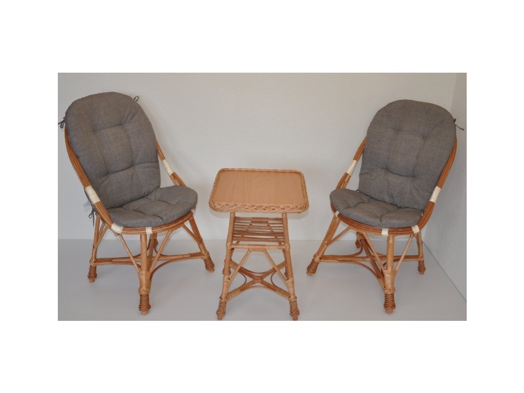 Sedací souprava sestávající se ze dvou křesel, stolku a sady polstrů.