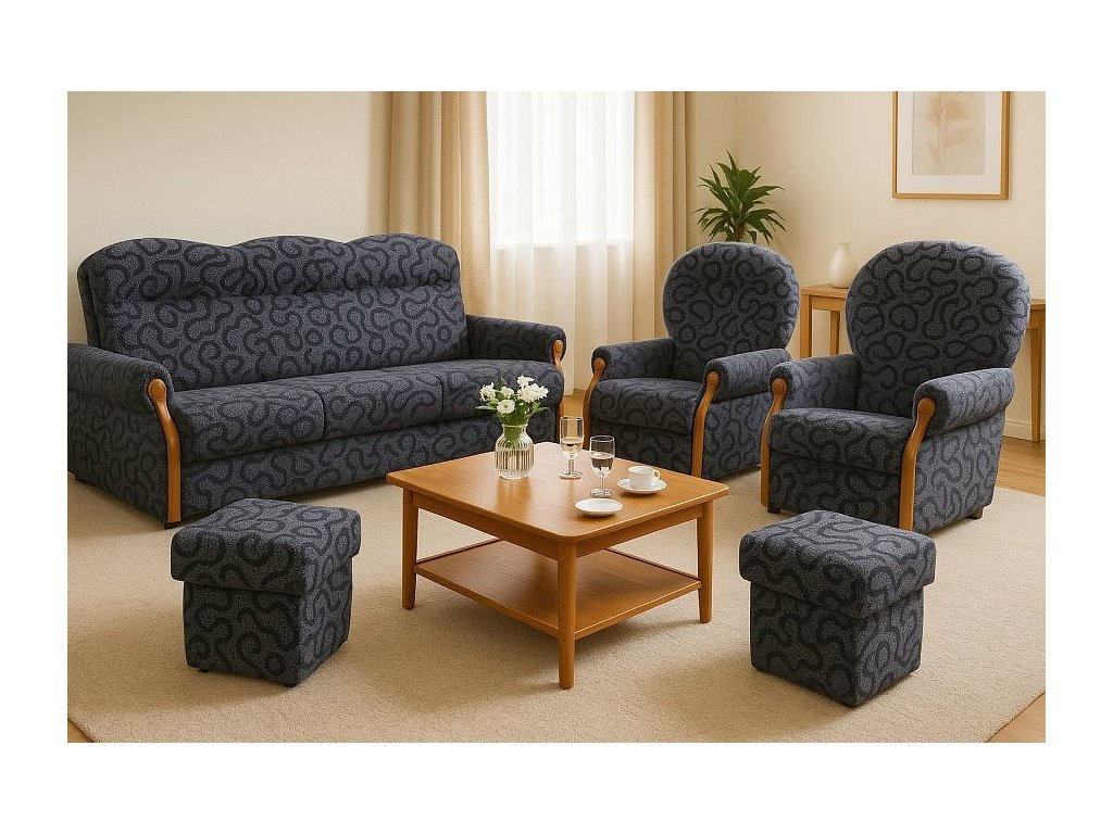 Sedací souprava Kara je stále velmi oblíbeným klasickým modelem sedací soupravy v provedení 3F+1+1+2T. Je velmi pohodlná a zároveň praktická. Sedací souprava je rozkládací a samozřejmostí je i úložný prostor, který můžete využít např.na lůžkoviny. Jednoduchým rozkladem pomocí systému "klik klak" vznikne lůžko k příležitostnému přespání Vaší návštěvy. Plocha po rozložení je 188x125 cm. Sedací souprava je potažena kvalitní látkou, v kombinaci vzoru a jednobarevné látky. Pohodlné posezení zajišťuje kvalitní výplň sedáků z polyuretanové pěny. Vyšší područky umožňují bezpečné a pohodlné vstávání i pro osoby s omezenou schopností pohybu. Sedačka nemá čalouněná záda, ale křesla jsou celočalouněná a mohou být tedy umístěna volně v prostoru. Cena sedací soupravy je uvedena za rozkládací trojsed, dvě křesla a dva taburety. Vyobrazené doplňky a dekorace nejsou v ceně.
