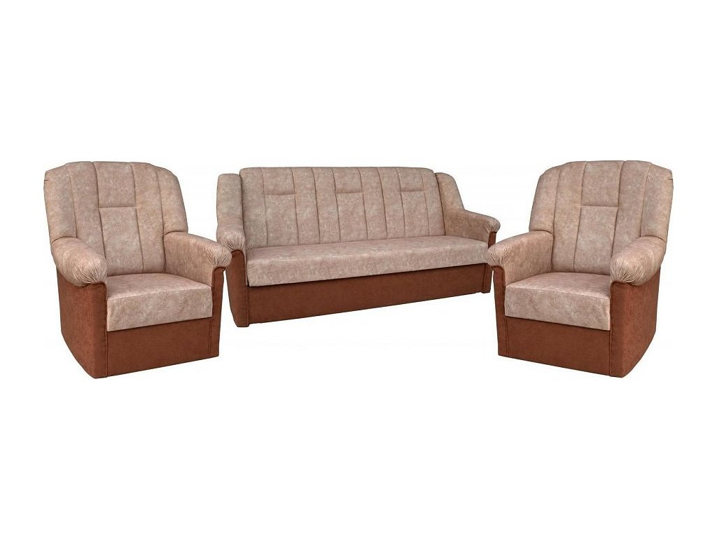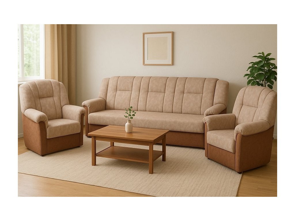 Klasická rozkládací sedací souprava vhodná také do menších bytů. Sedací souprava má praktický úložný prostor a jednoduchým rozkladem vznikne lůžko vhodné k příležitostnému spaní. Sedací souprava se skládá z rozkládacího trojsedu a dvou křesel. Tato sedačka je očalouněná kvalitní potahovou látkou. Tato látka je snadno čistitelná suchou pěnou.
