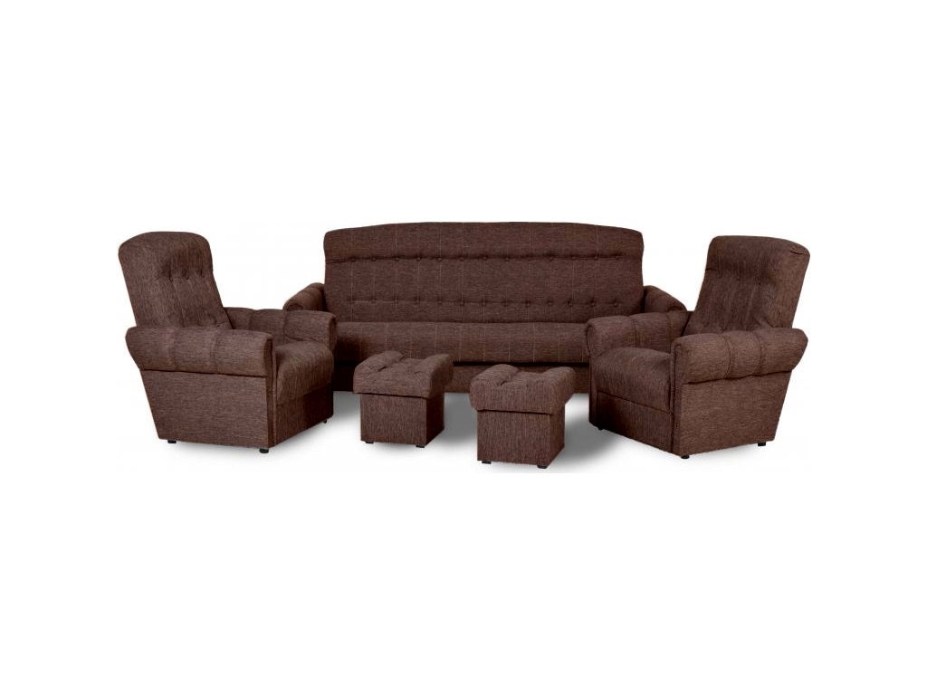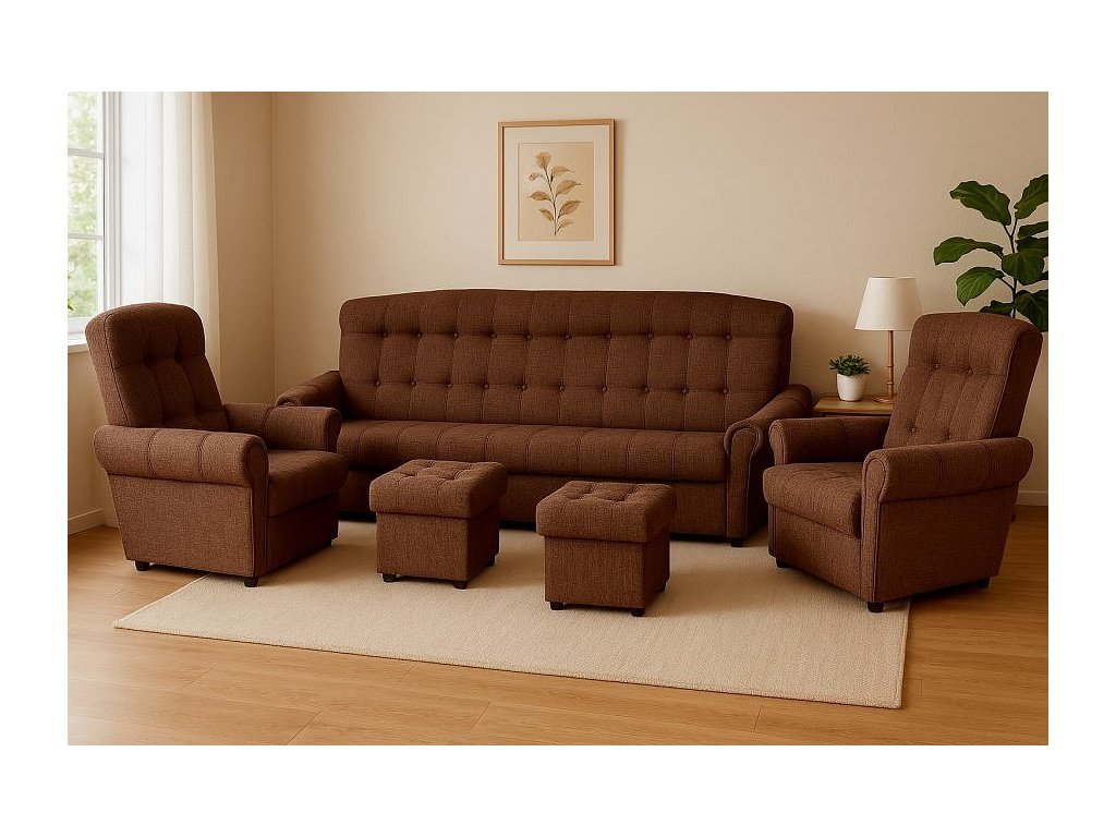 Klasická sedací souprava v hnědé barvě je velice oblíbená. Je rozkládací a součástí je praktický úložný prostor. Svou kombinací trojsedu, dvou křesel a dvou taburetů je vhodná i pro vícečlennou rodinu. Trojsed lze jednoduše rozložit stylem klik/klak a tím poslouží k občasnému přespání. Po rozložení vznikne plocha pro spaní 188 cm x 120 cm. Sedáky jsou z PUR pěny, která zajistí pohodlné sezení a vyšší opěrky ocení především starší lidé. Taburety mají také úložný prostor. Nosnost sedací soupravy do 120 kg. Dodáno v demontu.