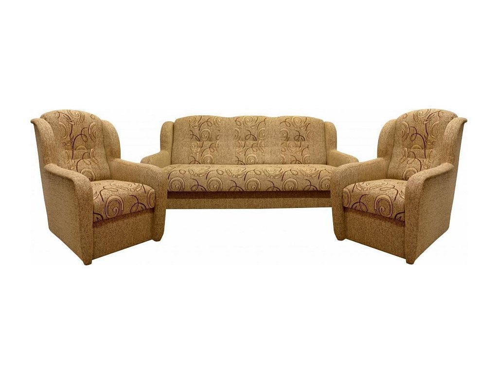Ušák je stále velmi oblíbeným klasickým modelem sedací soupravy v provedení 3F+1+1. Je velmi pohodlná a zároveň praktická. Sedací souprava je rozkládací a samozřejmostí je i úložný prostor. Jednoduchým rozkladem pomocí systému "klik klak" vznikne lůžko k příležitostnému přespání Vaší návštěvy. Sedací souprava je potažena kvalitní látkou a nabízíme ji v několika barvách, ze kterých si určitě vyberete tu nejvhodnější pro Váš obývací pokoj. Výpň sedáků tvoří pružiny v kombinaci s kvalitní PUR pěnou. Tato kombinace zajistí velmi pohodlné sezení. Cena sedací soupravy je uvedena za rozkládací trojsed a dvě křesla.