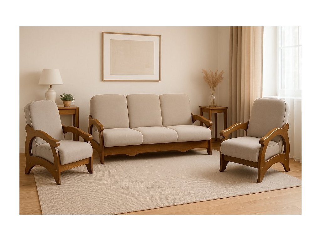 Sedací souprava Viki s rozkládacím trojsedem a dvěma křesly. Sedací souprava má úložný prostor a jednoduchým rozkladem vznikne lůžko 188x130 cm na občasné přespání pro dvě osoby. Výplň sedáku tvoří pružiny bonell v kombinaci s kvalitní PUR pěnou. Sedací souprava je očalouněná kvalitní látkou Velo, která je velmi příjemná na dotek a je odolná proti vsakování tekutin. Čalounění v kombinaci se dřevem působí velice stylově. Bočnice jsou vyrobené z bukového masivu, moření je možné v různých barevných odstínech. Sedací soupravu lze objednat i v jiných barevných provedeních (viz. vzorník látek níže). Odstíny nebo kresba dřeva nemusí přesně odpovídat vyobrazeným vzorkům.