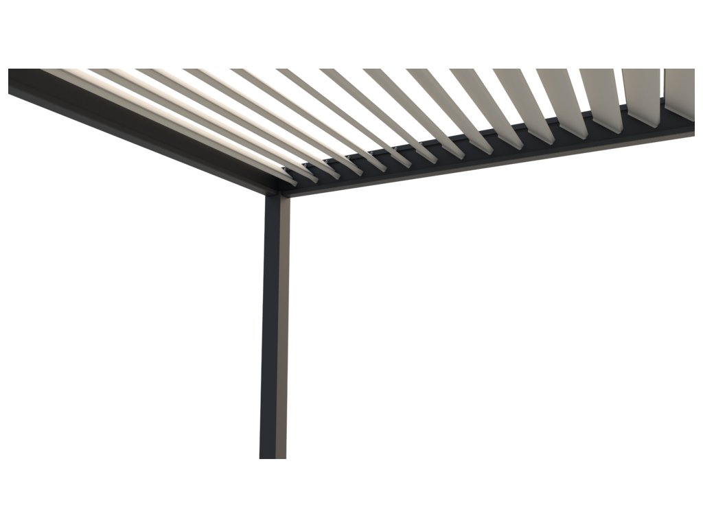 25 nastavitelných otočných dvojitých lamel (dvě vrstvy s dutým vnitřkem) Vás ochrání nejen před sluncem, ale i před deštěm. Lamely lze otáčet od 0°, kdy docílíte úplně uzavřené střechy až do 135°, díky čemuž získáte skvělou mobilitu a možnost zastínit slunce z jakékoliv strany.