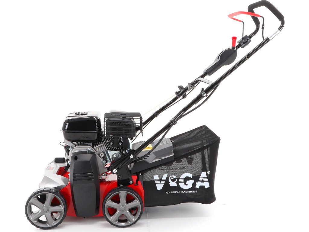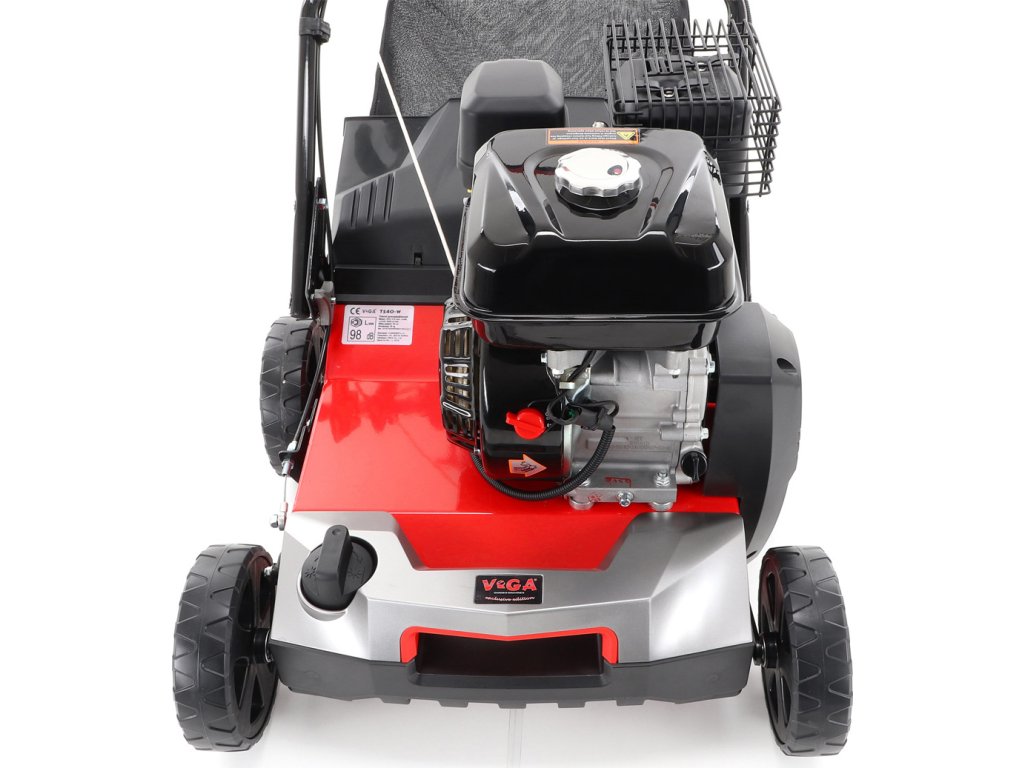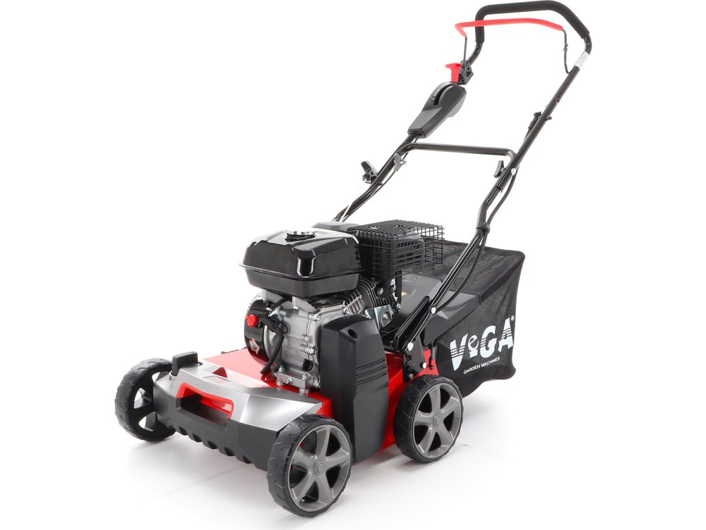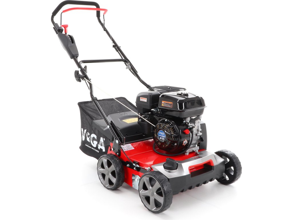 Motorový provzdušňovač trávníků VeGA TS40-W 3in1 s motorem VeGA 6HP, šířka pracovního záběru je 400 mm, plynulé centrální nastavením výšky, šasi je z oceli, sběrný koš o objemu 45l.
