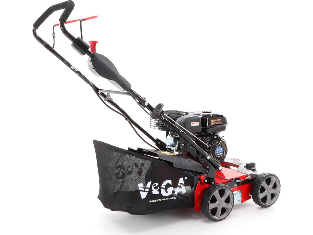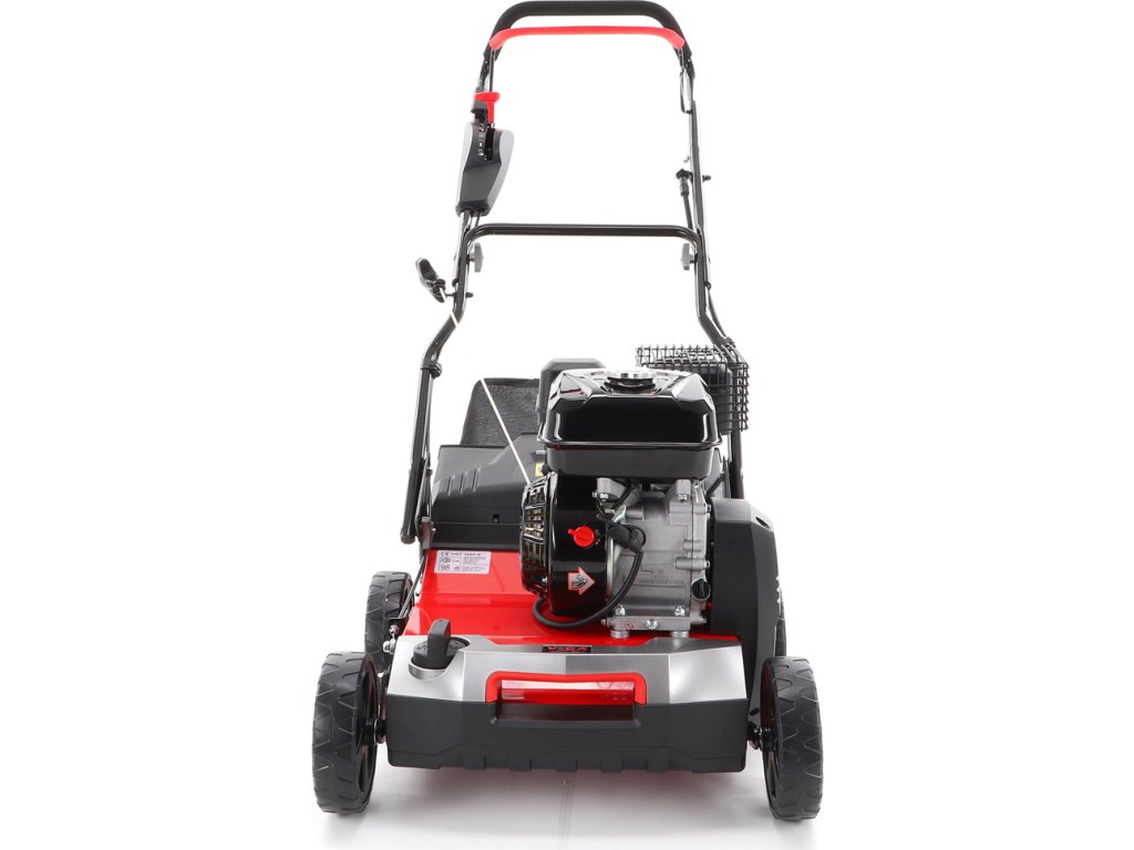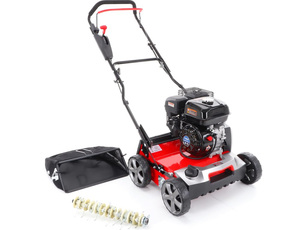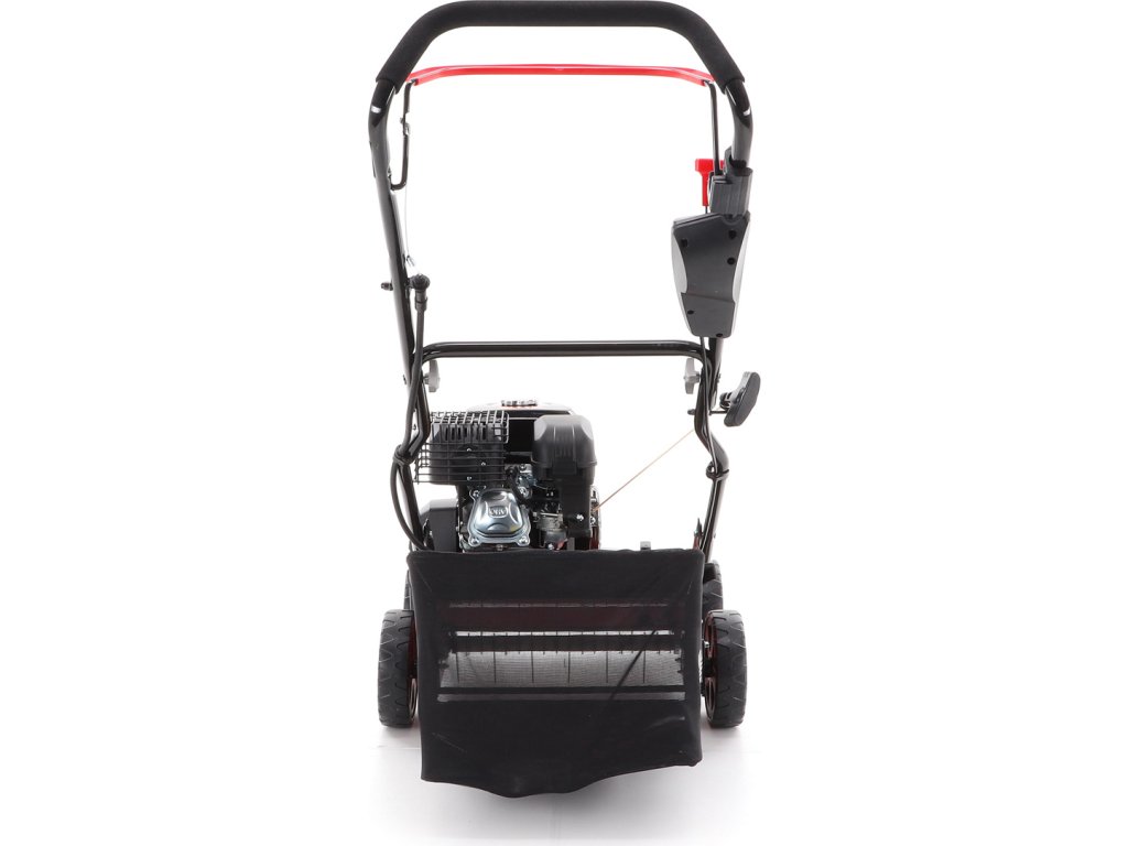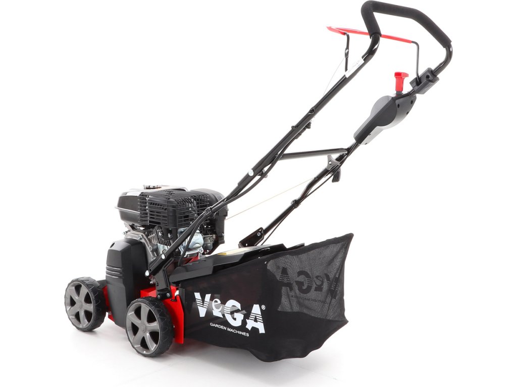 Motorový provzdušňovač trávníků VeGA TS40-W 3in1 s motorem VeGA 6HP, šířka pracovního záběru je 400 mm, plynulé centrální nastavením výšky, šasi je z oceli, sběrný koš o objemu 45l.