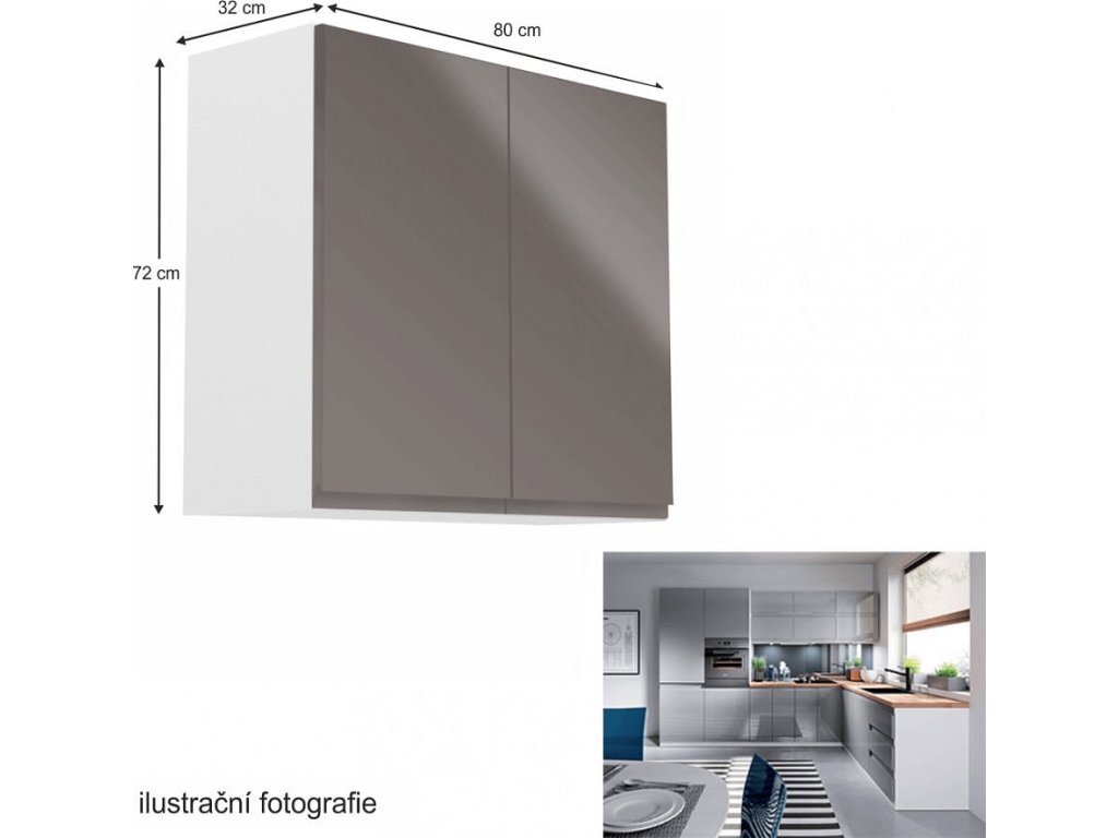 Horní skříňka, Aurora G80 Provedení: DTD laminové / MDF Barva: bílá / šedá lakovaná extra vysoký lesk Rozměry (ŠxHxV): 80x32x72 cm Tloušťka materiálu: 15 mm Pracovní deska není součástí skříněk. Je možné si doobjednat pracovní desku v provedení dub lefkas tmavý tloušťky 38 mm za 1.350 Kč / bm. Možnost dokoupit dřez LAY ON. Ke každé dolní skříňce, kromě D25PZ, je třeba doobjednat 2ks úchytů na sokel- cena 20 Kč. Spodní skříňky jsou dodávány včetně dolní lišty, avšak přesný rozměr, který potřebujete, je třeba uvést do poznámky v objednávce. Pokud rozměr neuvedete, může se stát, že vám sokl nebude dodán.