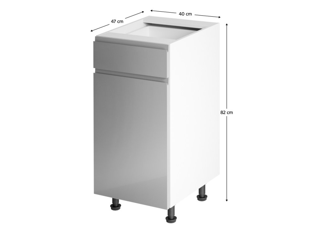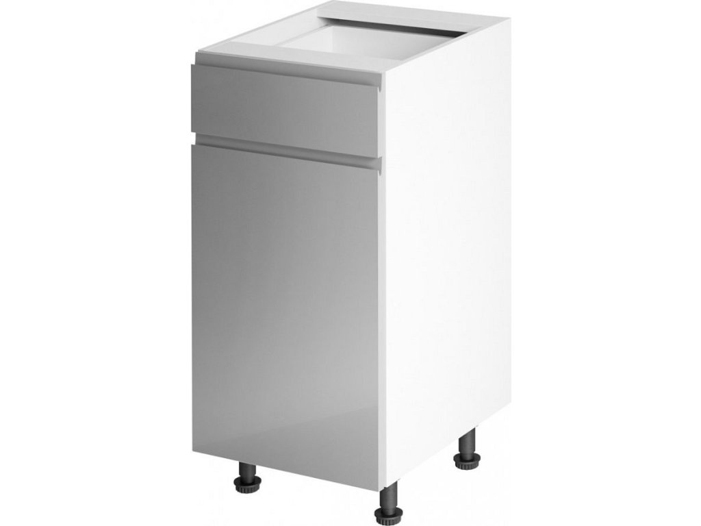 Spodní skříňka, Aurora D40S1 Provedení: DTD laminové / MDF Barva: bílá / šedá extra vysoký lesk Rozměry (ŠxHxV): 40x47x82 cm Tloušťka materiálu: 15 mm Pracovní deska není součástí skříněk. Je možné si doobjednat pracovní desku v provedení dub lefkas tmavý tloušťky 38 mm za 1.350 Kč / bm. Možnost dokoupit dřez LAY ON. Ke každé dolní skříňce, kromě D25PZ, je třeba doobjednat 2ks úchytů na sokel- cena 20 Kč. Spodní skříňky jsou dodávány včetně dolní lišty, avšak přesný rozměr, který potřebujete, je třeba uvést do poznámky v objednávce. Pokud rozměr neuvedete, může se stát, že vám sokl nebude dodán.