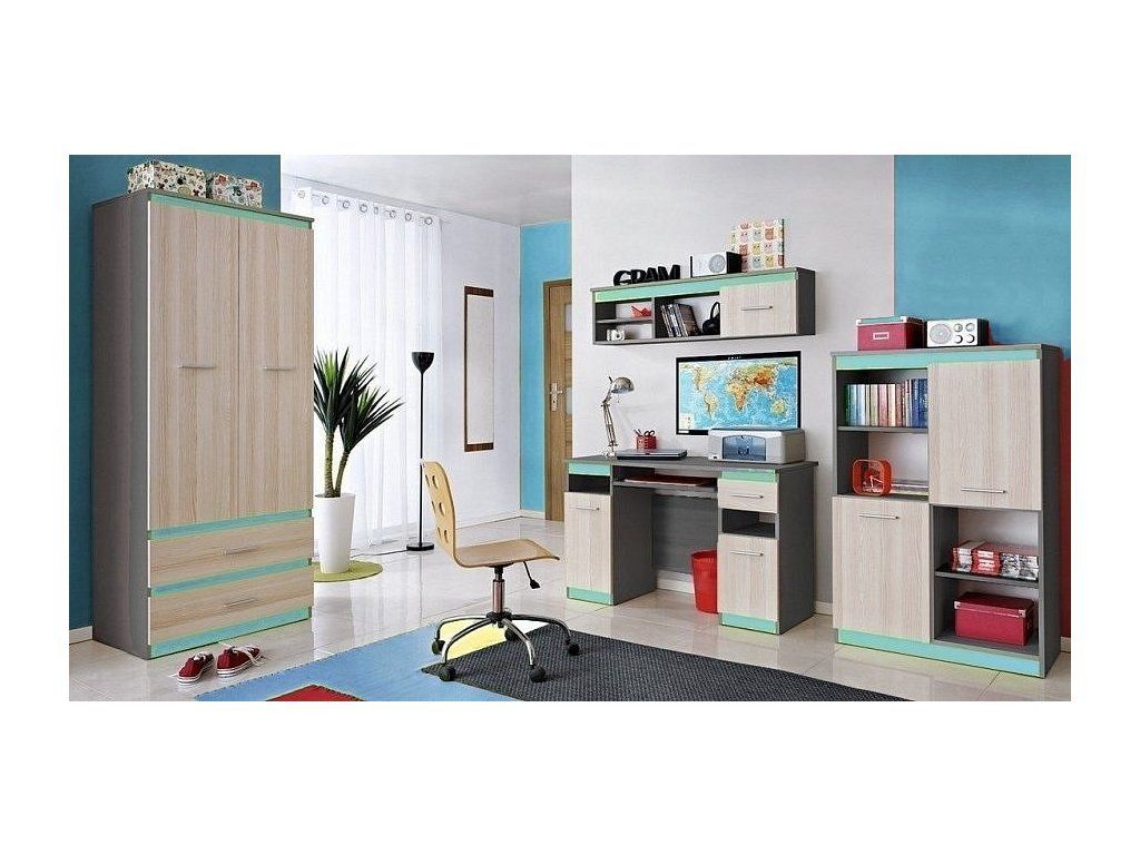 Praktický nábytek do dětského pokoje vhodný jak pro holky, tak i kluky. Barvy jsou neutrální, jedná se o jasan coimbra v kombinaci se světle modrou (viz. foto). Korpus je v barvě grafit. Nábytek je vyroben z kvalitního lamina ( korpus 16 mm, dvířka 18 mm ). Tato dětská sestava se skládá ze 4 dílů ( š/h/v ) - šatní skříň 80 x 52 x 200 cm, PC stolek 120 x 50 x 75 cm, kombinovaná police 120 x 22 x 34 cm a kombinovaný regál 80 x 43 x 128 cm. Sestavu lze koupit pouze celou, jednotlivé díly nelze koupit zvlášť. Dodáváme v demontovaném stavu.Doplňkové parametry