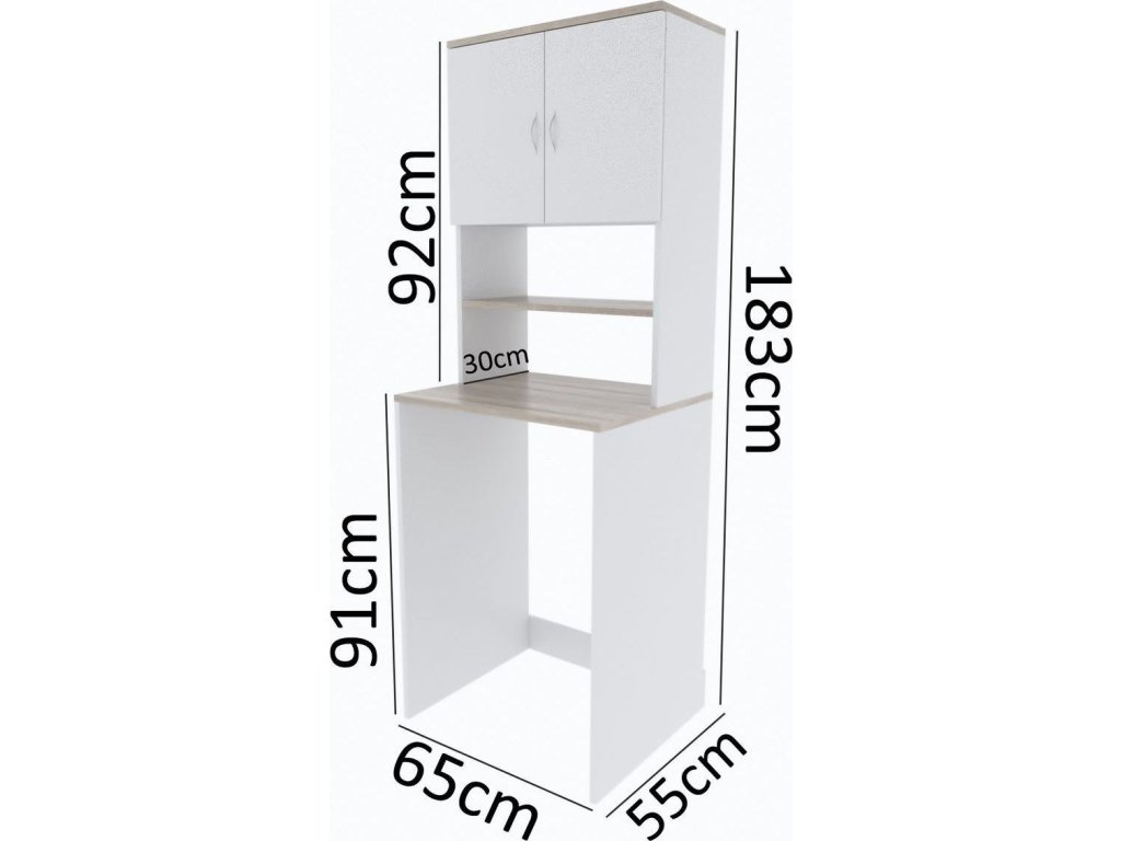 Koupelnová skříň s policemi a vrchní skříňkou vhodná i pro umístění nejen pračky, rozměry 65 × 55 × 183 cm.