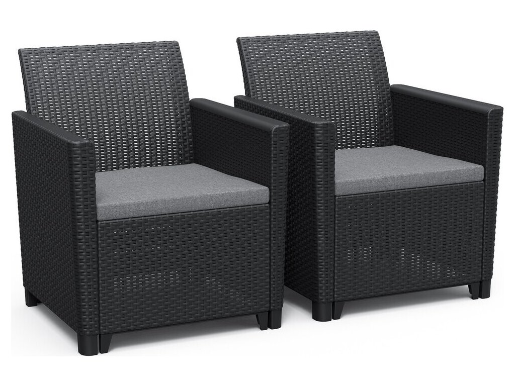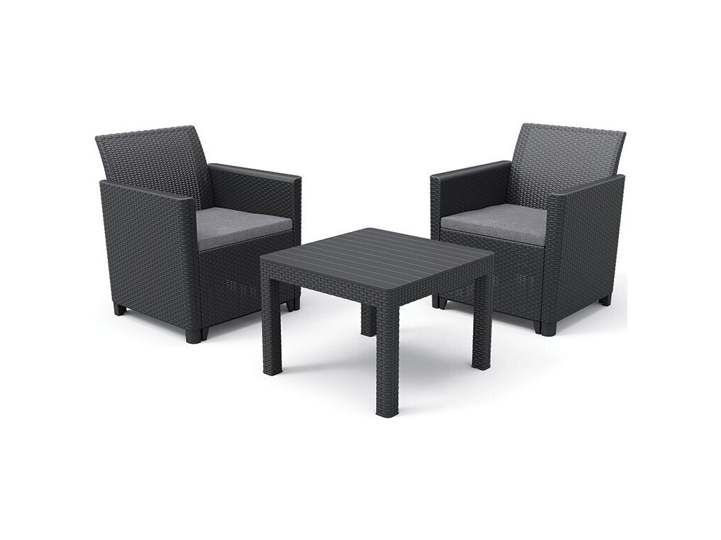 Proměňte svou terasu, balkon nebo dvorek soupravou Claire, která je vyrobena z lisovaného plastu v imitaci přírodního ratanu. Jedná se o lehký, ale zároveň pevný materiál. Souprava se skládá ze 2 křesílek a stolku. Vyznačuje se typickými hranatými liniemi a hladkými loketními opěrkami