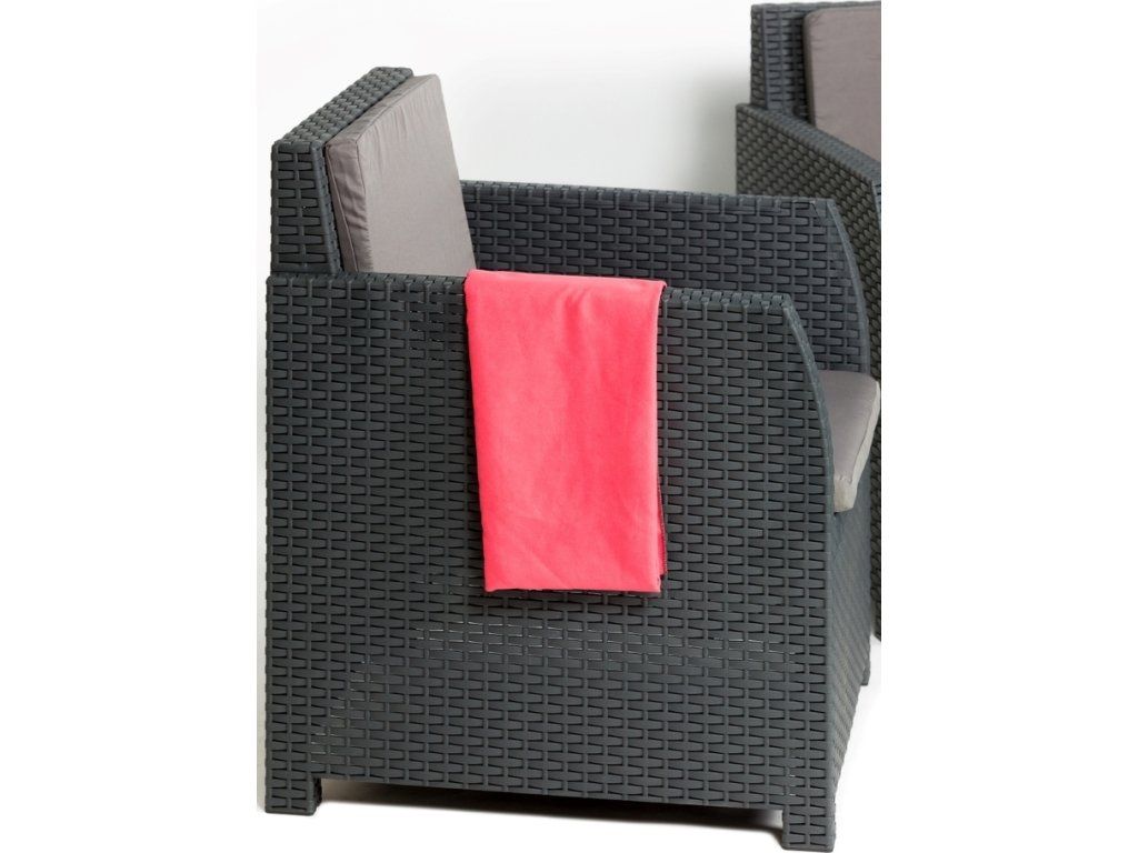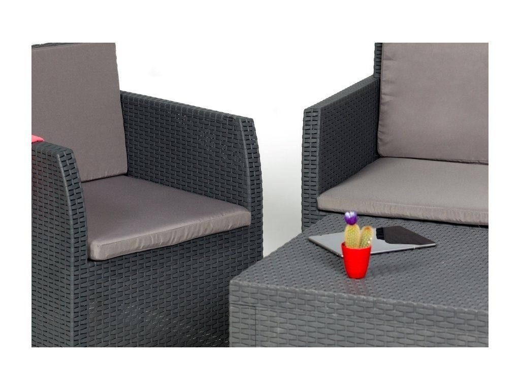 Elegance a trvanlivost jdou ruku v ruce - tento set je vyroben z kvalitního lisovaného plastu s imitací ratanu, což mu dodává sofistikovaný vzhled a umožňuje snadnou údržbu. Součástí tohoto setu jsou šedé podušky, a to jak opěrky, tak sedáky, s odnímatelným a pratelným potahem, který zajišťuje maximální pohodlí. Bezstarostně se můžete uvelebit a užívat si slunečných dnů nebo večerů v zahradě.