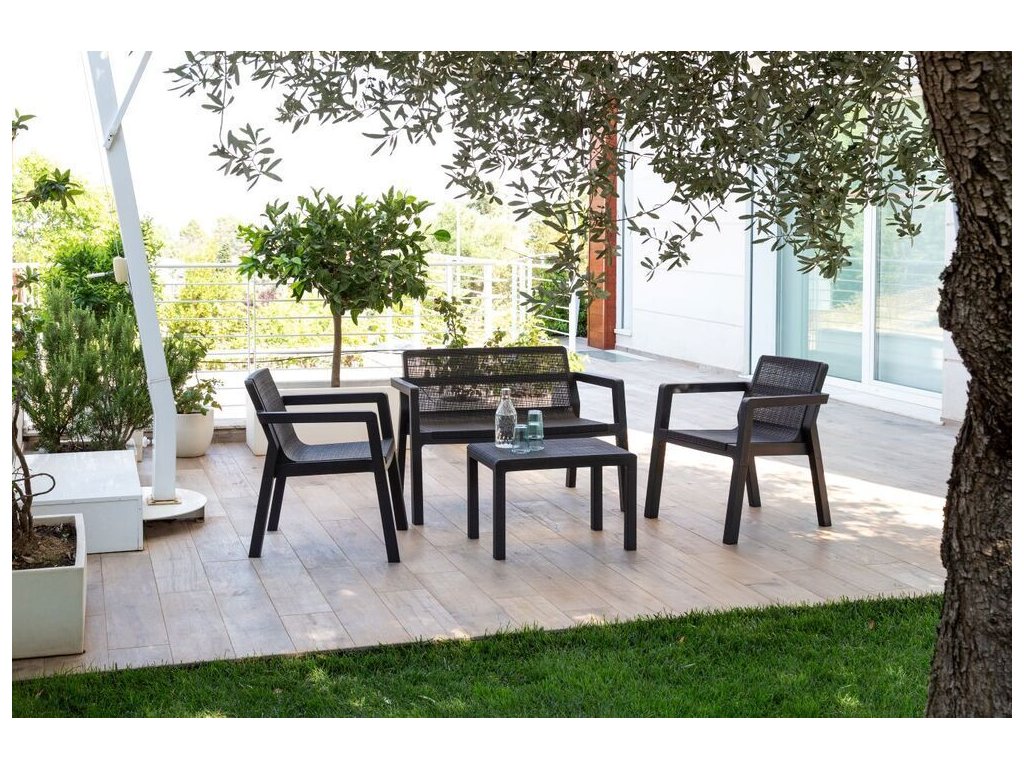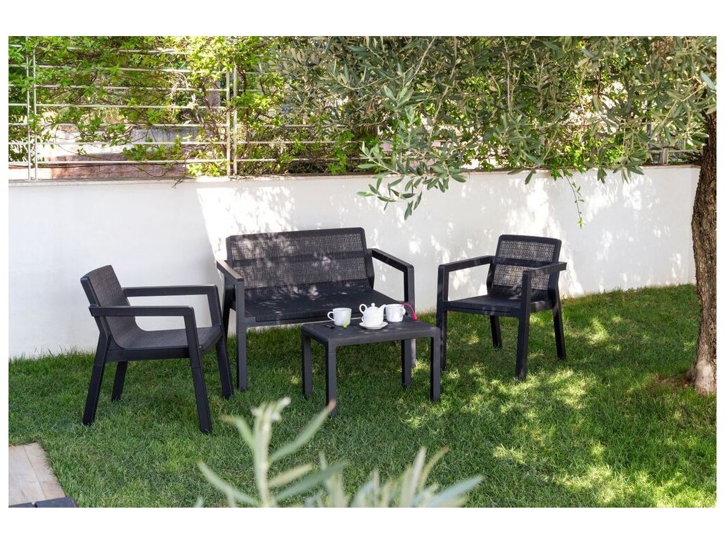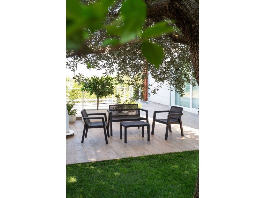 S tímto setem z lisovaného plastu v designu inspirovaným pletenou jutou přinesete do Vašeho exteriéru nejenom pohodlí, ale i nádech elegance. Set se skládá ze dvou pohodlných křesel, sofa a praktického stolku, což vytváří ideální prostor pro posezení s rodinou nebo přáteli.