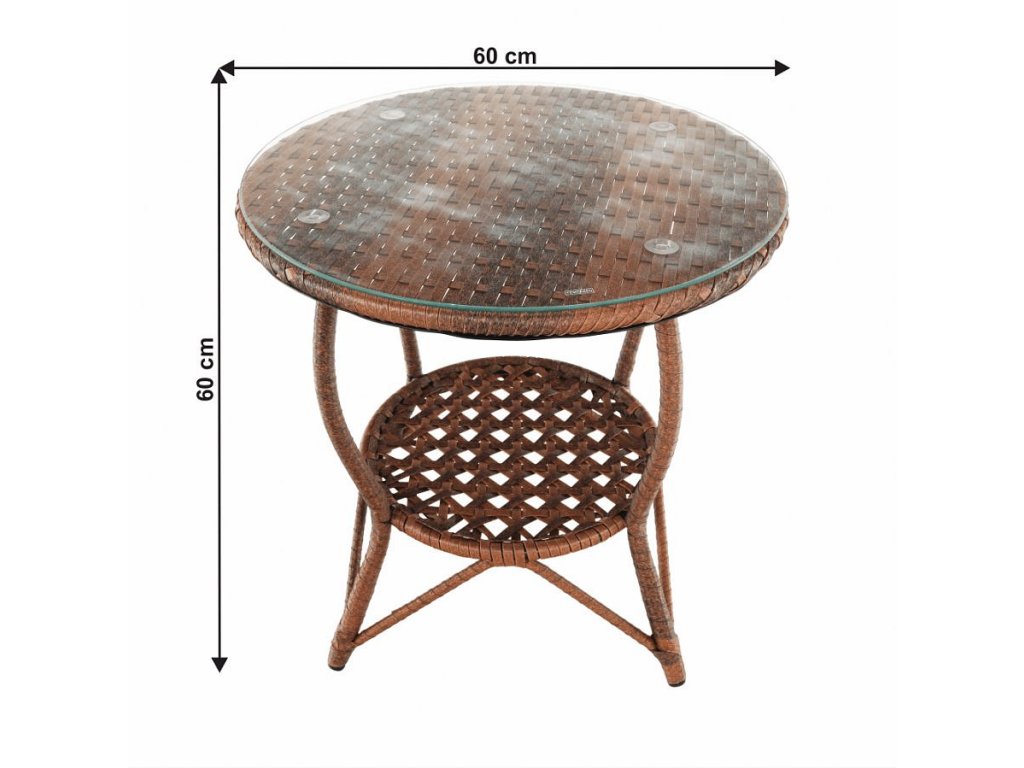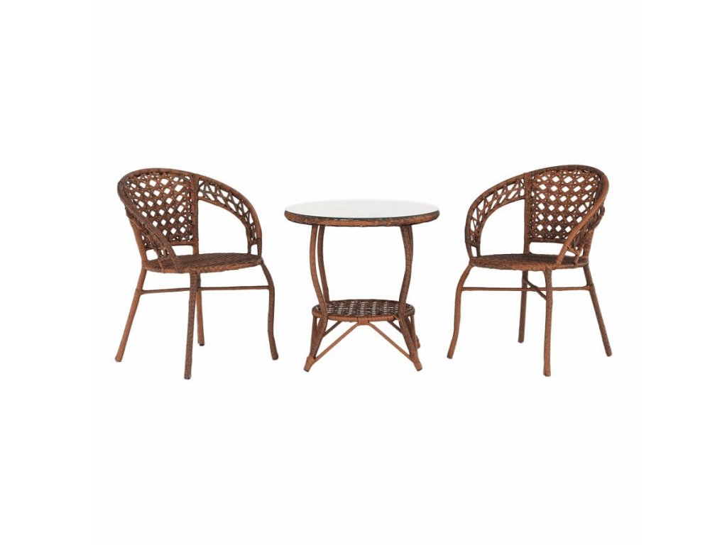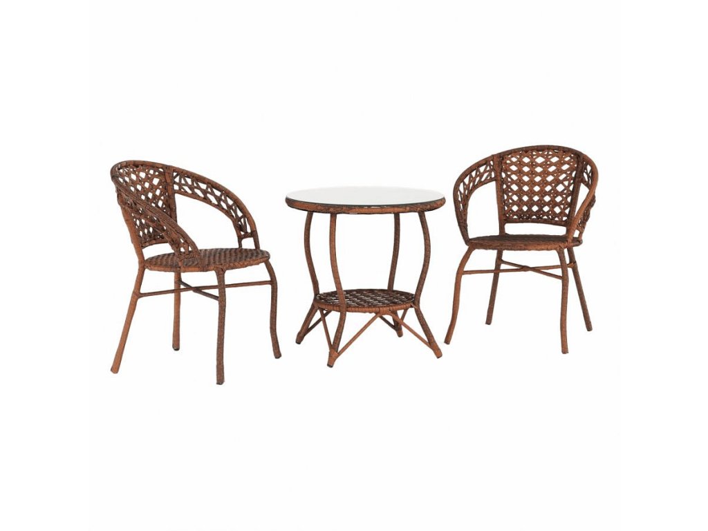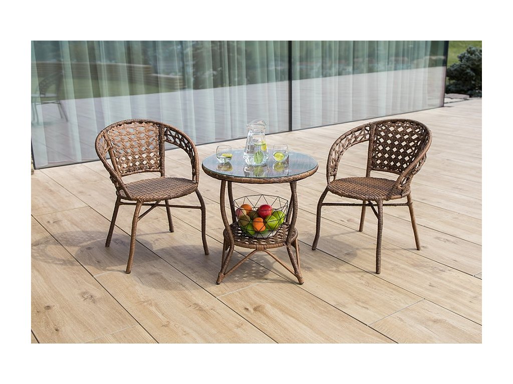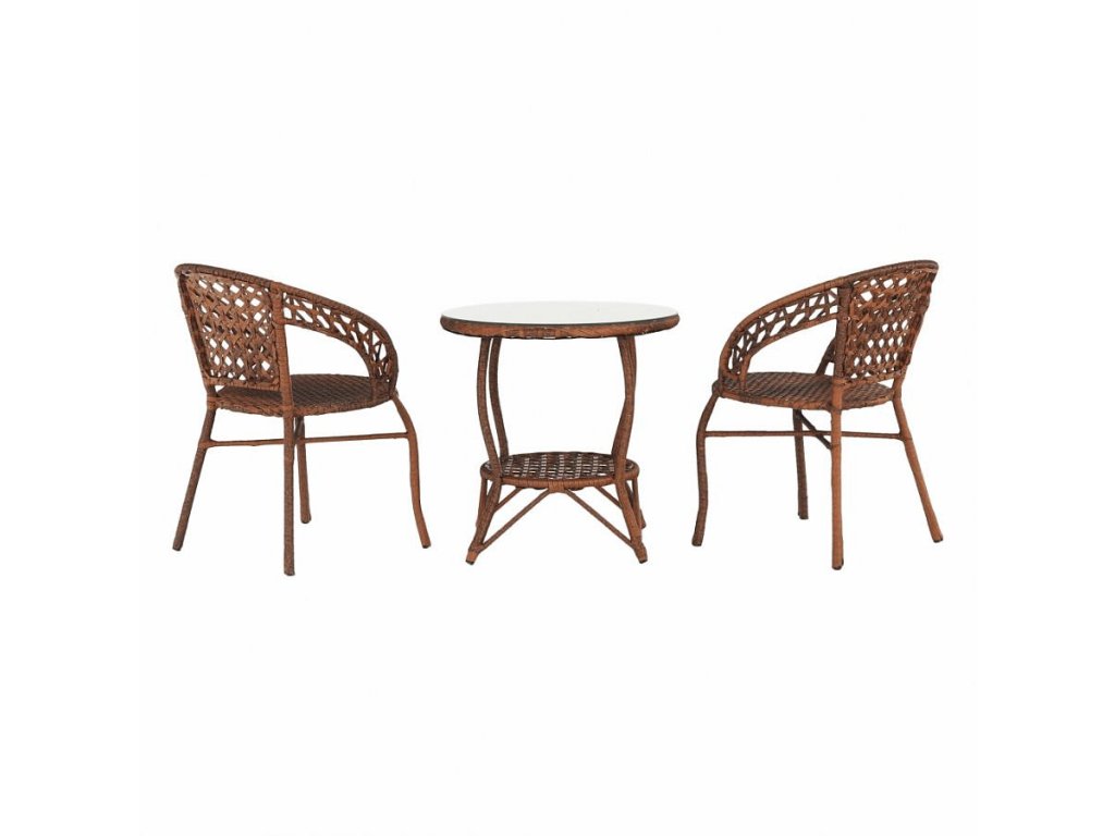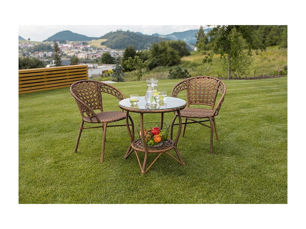 Materiál: umělý ratan / ocel / tvrzené sklo Barva: hnědá Stůl (priemerxV): 60x60 cm Židle (ŠxHxV): 58x59x74 cm Hloubka sedu židle: 45,5 cm Výška sedu židle: 41 cm Nosnost židle: 90 kg 3-dílná souprava jeden stůl dvě židle Židle / křesla jsou stohovatelné Dodávané v monte