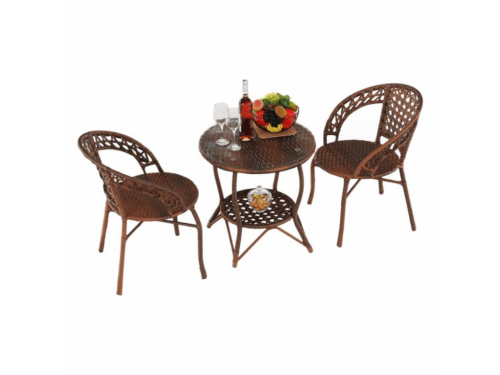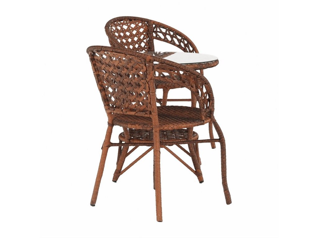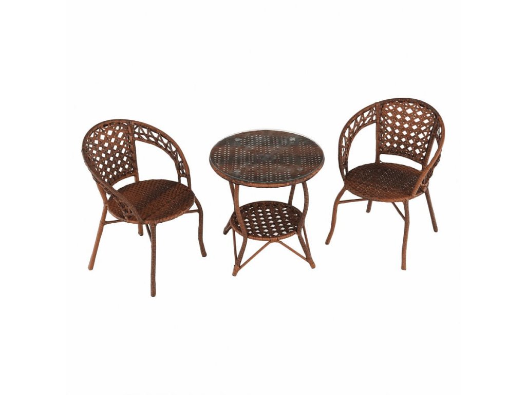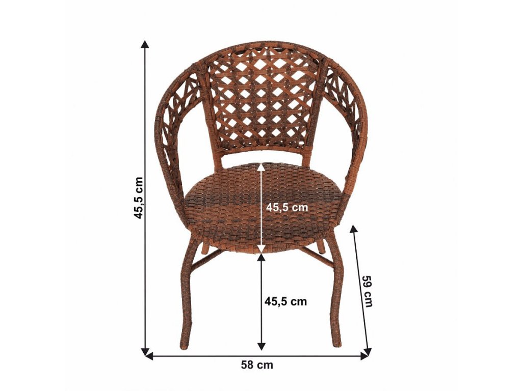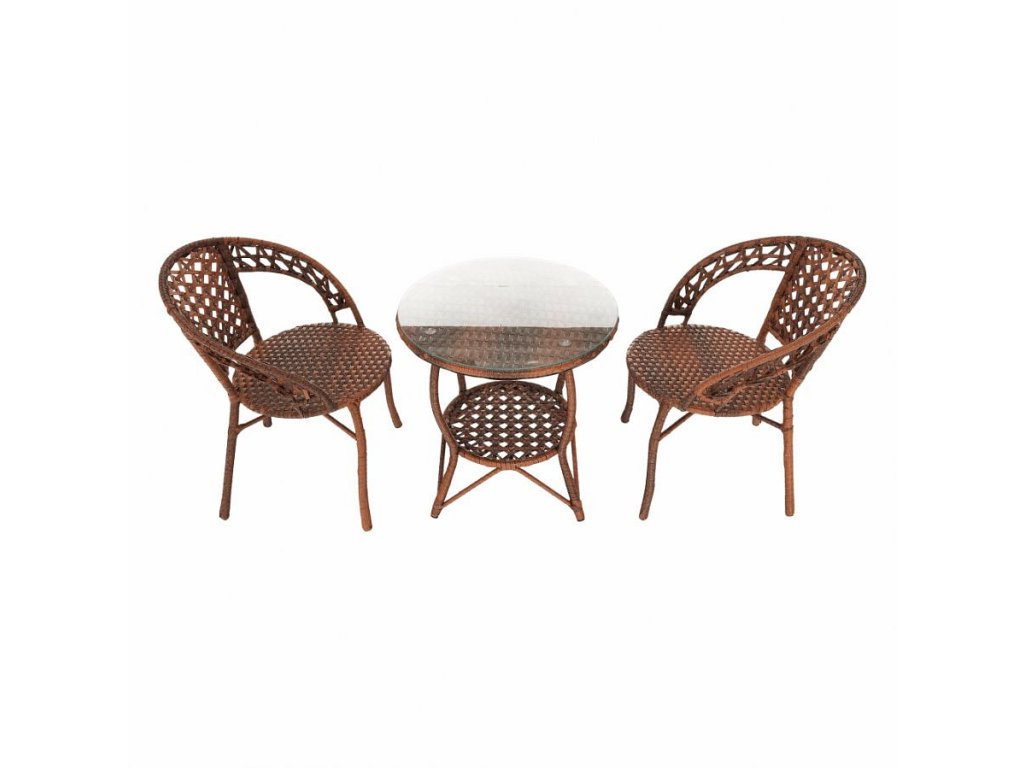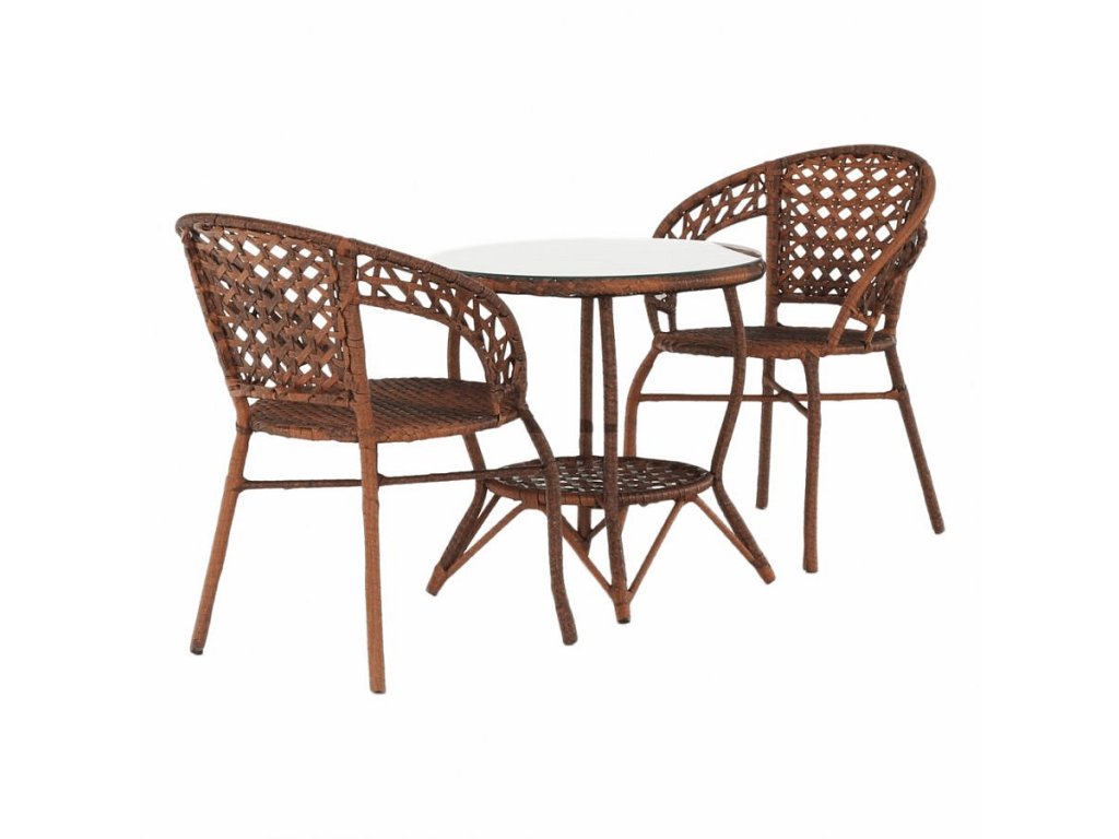 Materiál: umělý ratan / ocel / tvrzené sklo Barva: hnědá Stůl (priemerxV): 60x60 cm Židle (ŠxHxV): 58x59x74 cm Hloubka sedu židle: 45,5 cm Výška sedu židle: 41 cm Nosnost židle: 90 kg 3-dílná souprava jeden stůl dvě židle Židle / křesla jsou stohovatelné Dodávané v monte
