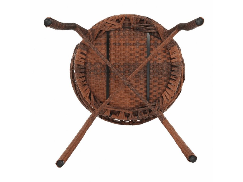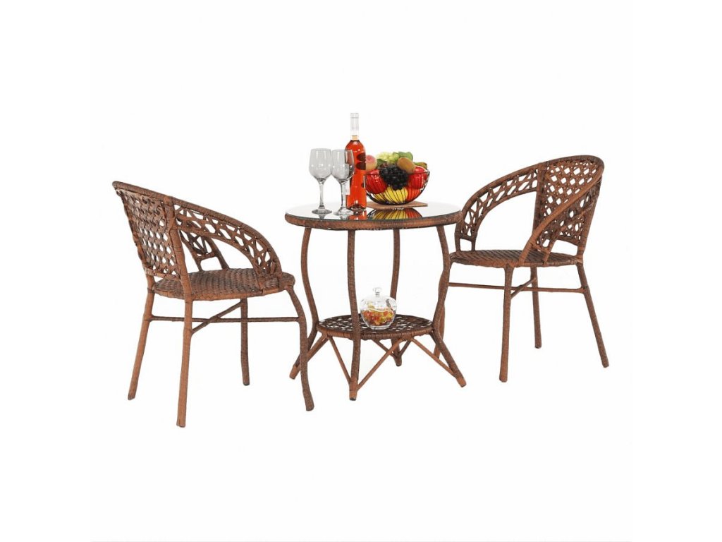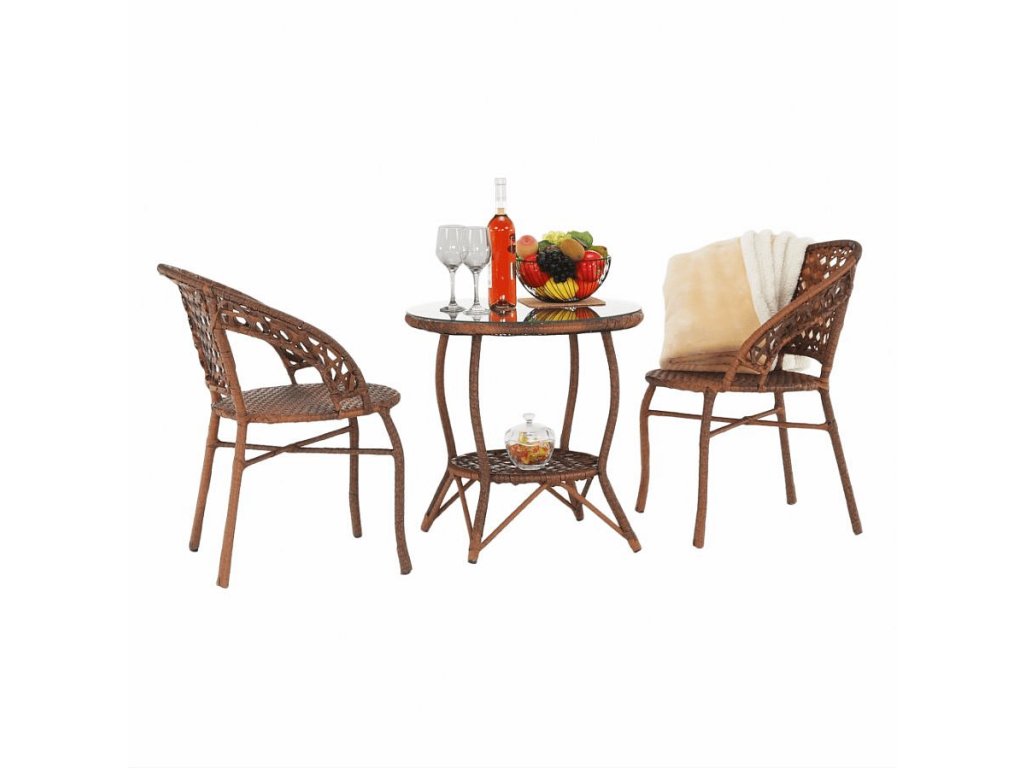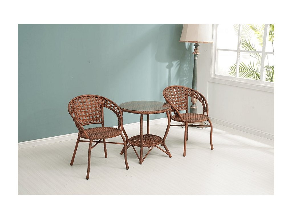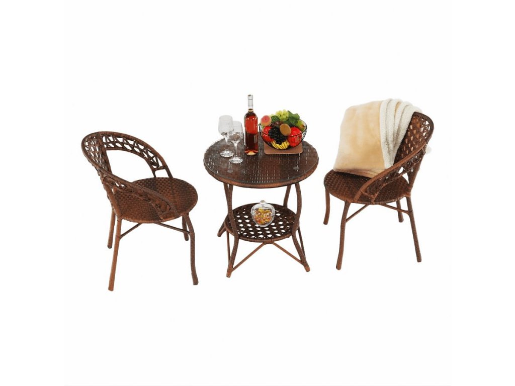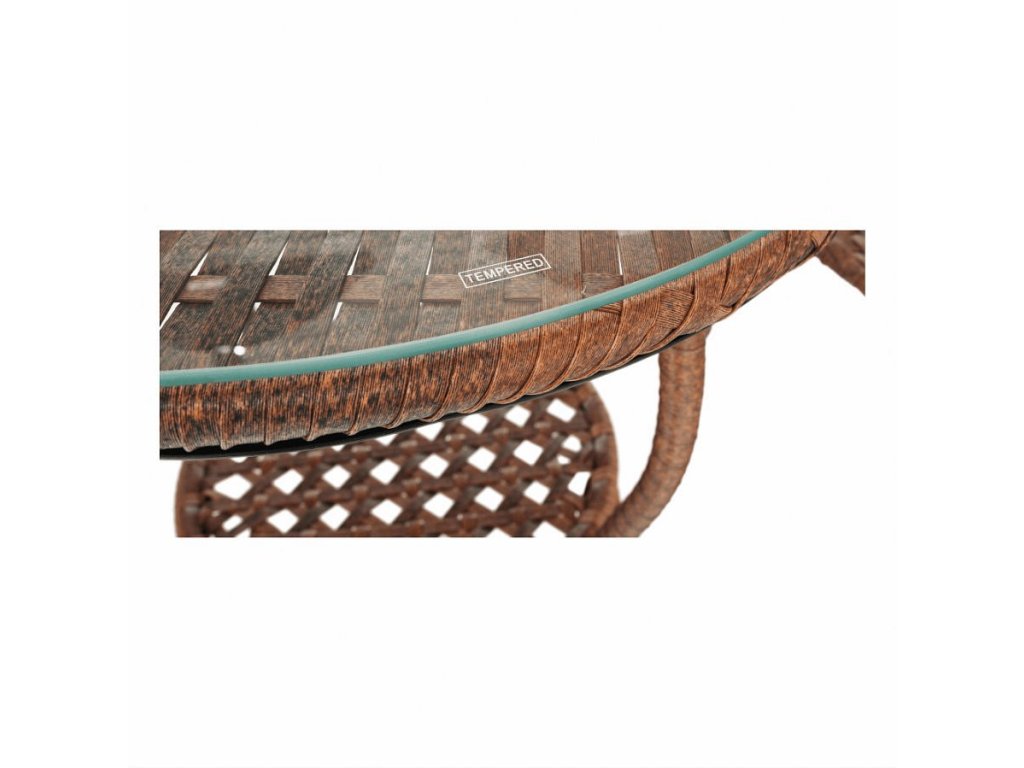 Materiál: umělý ratan / ocel / tvrzené sklo Barva: hnědá Stůl (priemerxV): 60x60 cm Židle (ŠxHxV): 58x59x74 cm Hloubka sedu židle: 45,5 cm Výška sedu židle: 41 cm Nosnost židle: 90 kg 3-dílná souprava jeden stůl dvě židle Židle / křesla jsou stohovatelné Dodávané v monte