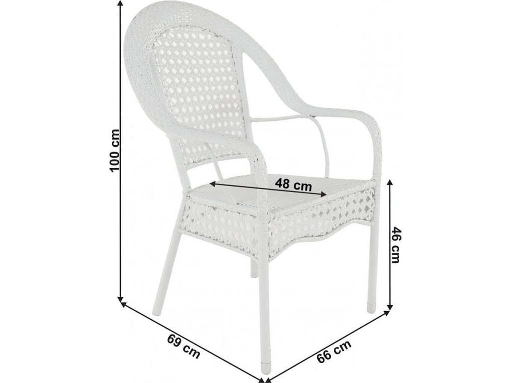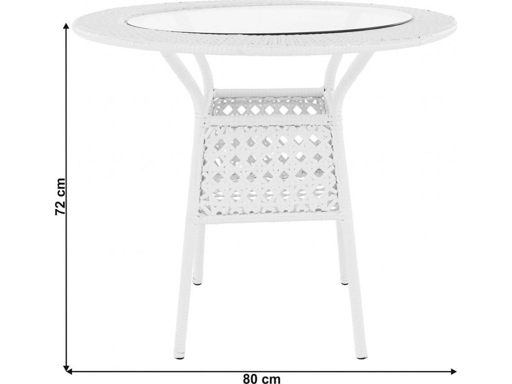 Zahradní set 1 + 4 KOVEN Materiál: umělý ratan / ocel / tvrzené sklo Barva: bílá Rozměry stůl (průměr xV): 80x72 cm Rozměry křesla (ŠxHxV): 66x69x100 cm Výška sedu křesla: 46 cm Hloubka sedu křesla: 48 cm Nosnost křesla: 100 kg Židle / křesla jsou stohovatelné Dodávané v monte